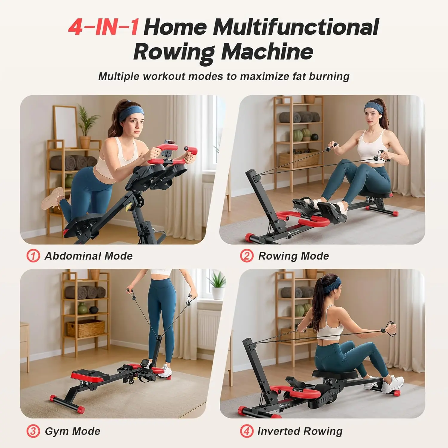 ·[Total Body Sculpting & Fat Burning] 4-in-1 Rowing Machine delivers rowing, abs sculpting, gym training, and inverted rowing modes. Easily switch between workouts to transition from cardio rowing to core sculpting while simultaneously toning arms, core, legs, back and targeting abs for 360 degree muscle engagement. All delivering gym quality results at home.