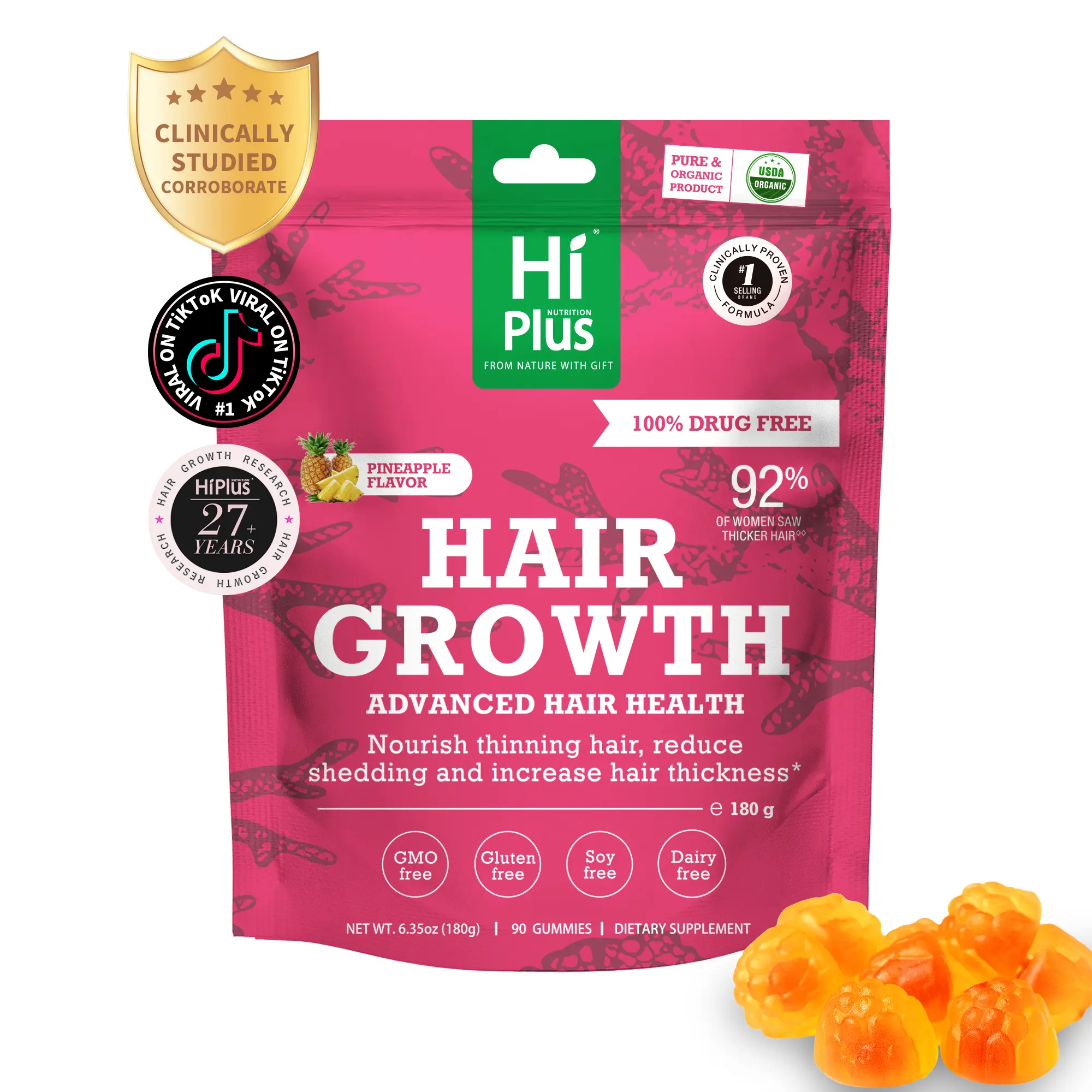 THICKENING SYSTEM: Take two HiPlus Hair Growth Supplements daily; 92% of women reported increased hair thickness when taking HiPlus twice a day for 3 to 6 months