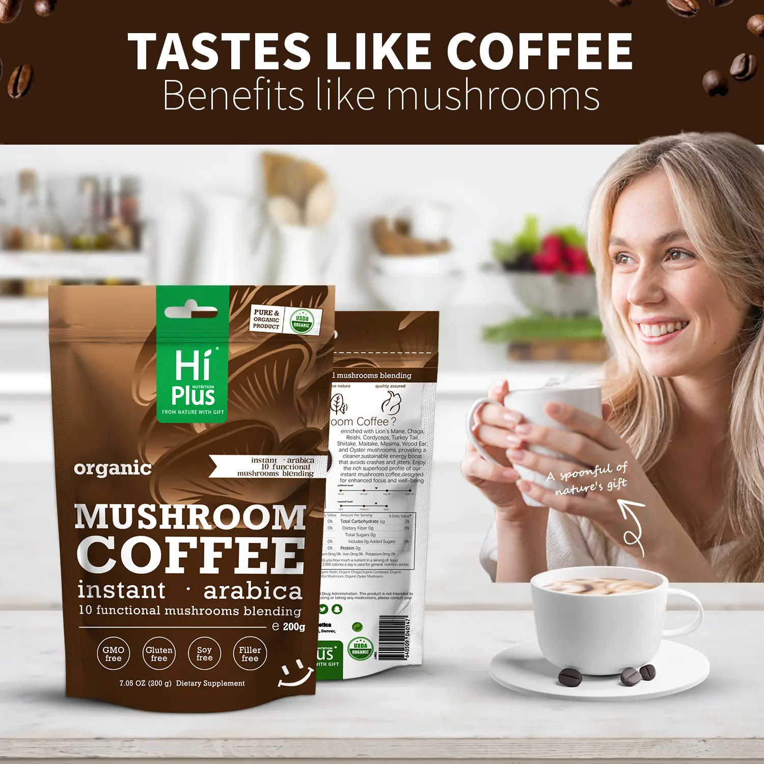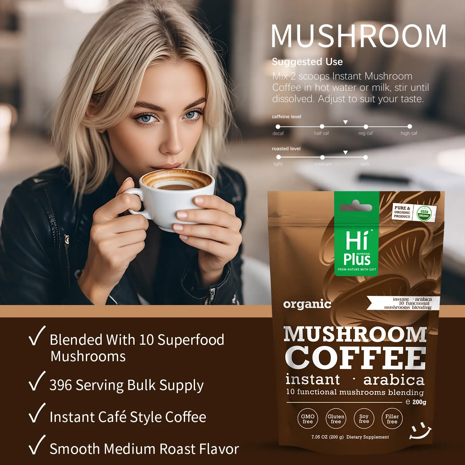·Enjoy a smooth, medium roast with Hi Plus Organic Instant Mushroom Coffee, crafted from premium Arabica coffee combined with 10 powerful superfood mushrooms. Perfect for family gatherings or a quiet moment, this coffee offers a rich, fresh flavor just like your classic brew, without the crash or jitters.