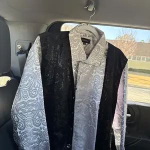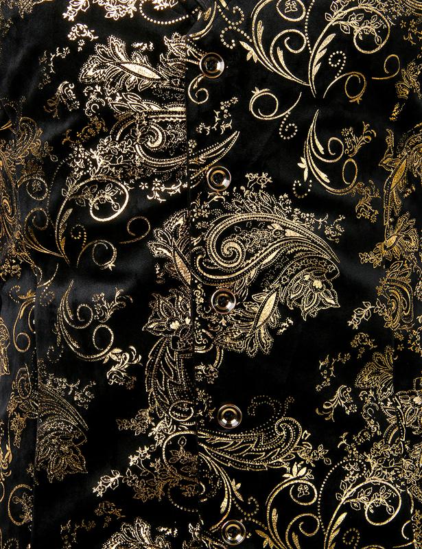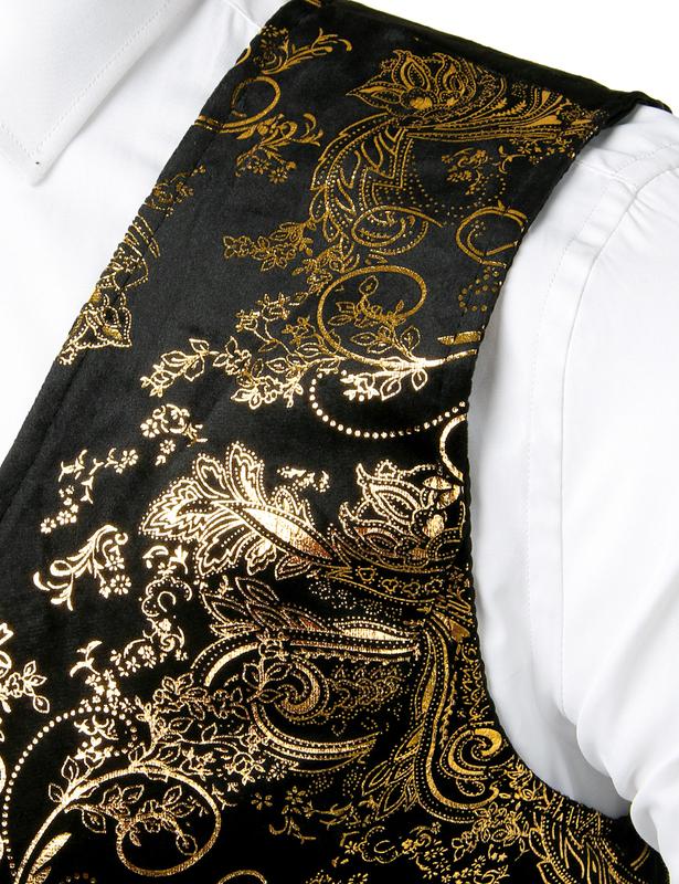 This vest features a shiny metallic gold, silver, royal blue, red, and black print. It has a symmetrical irregular hem, adjustable back strap, and 3-5 buttons down front. The new slim fit style ensures you look well-dressed. Perfect for men seeking a unique floral printing suit vest.