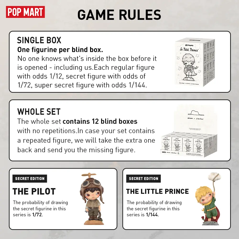 ·Blind Box: All items are figurine products with different designs. Each box contains one random design for value of 19.99 USD, and comes in a sealed box with no one knows what's inside-including us. This whole collection contains 12 regular figurine products (Odds: 1/12), and 2 secret edition(Odds: 1/72 , 1/144).
