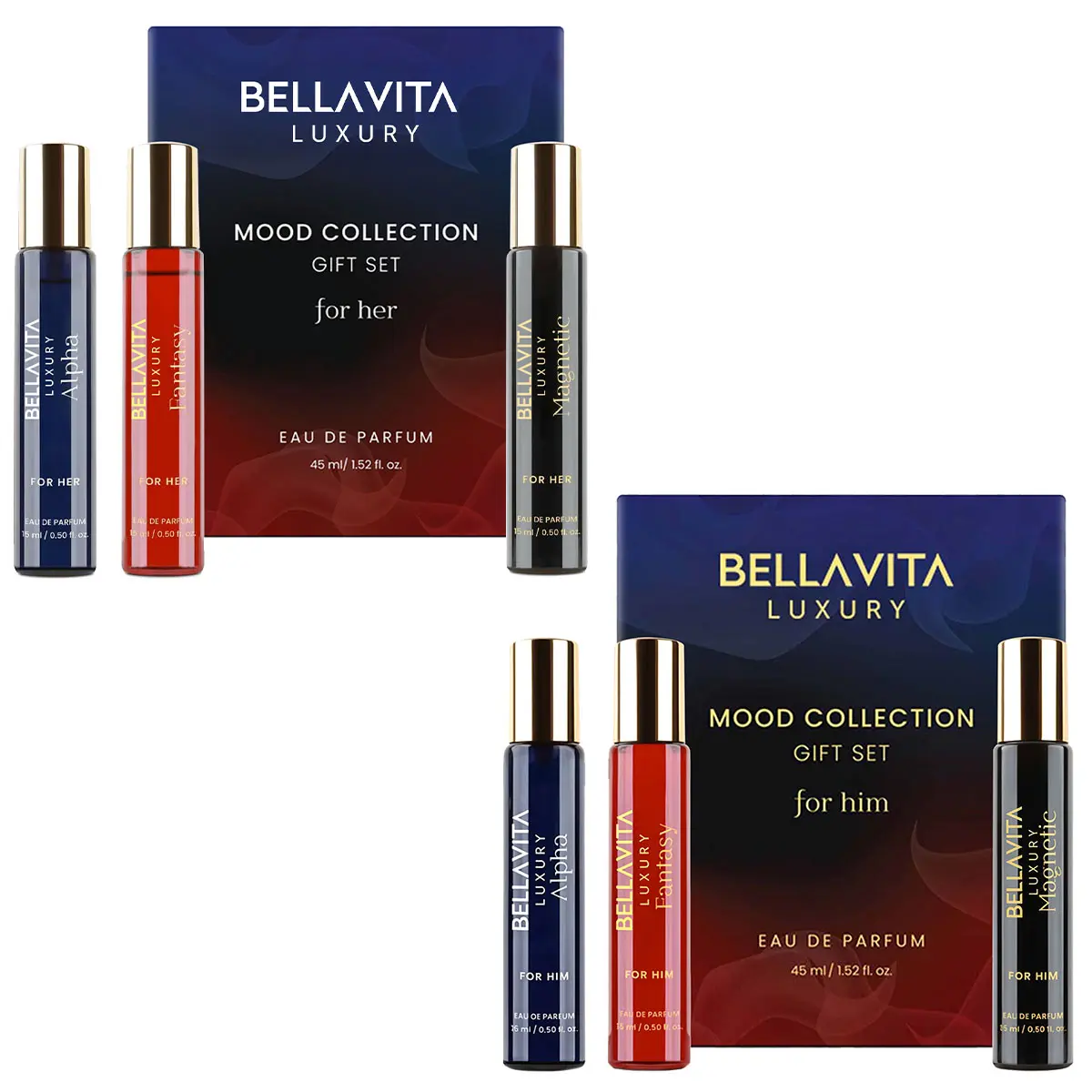 His & Hers Seduction by bellavita Luxury | Perfume Combo Gift Set | Men’s BMT 4×20 ml & Women’s BMT 4×20 ml | Alpha, Magnetic, Fantasy Him & Fantasy Her | Long Lasting Eau De Parfum | Vegan & Cruelty Free