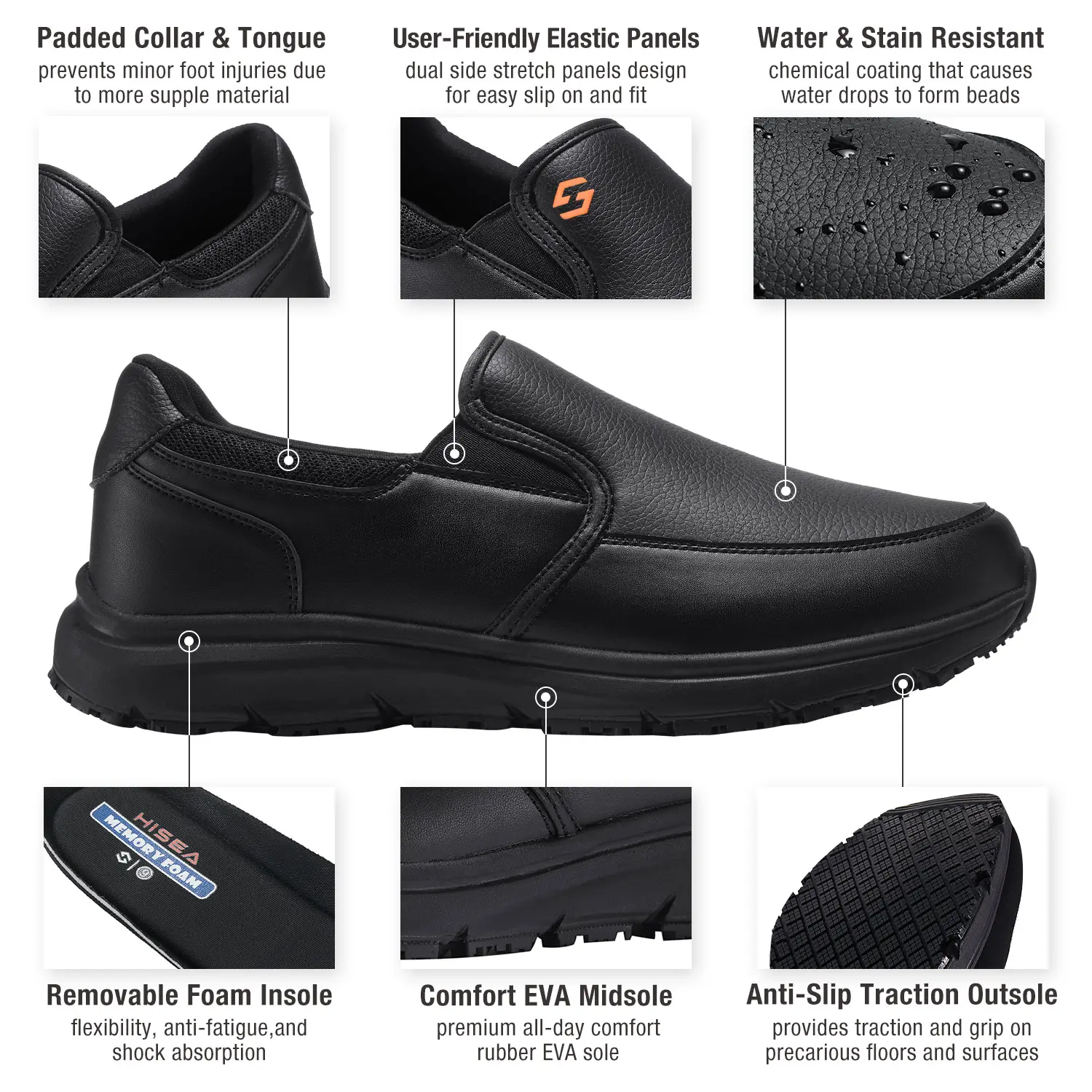 ·Comfort & Worker Friendly: Get comfort, safety with this HISEA non slip shoes for men food service. Enjoy reduced strain on your body with the shock-absorbing EVA midsole. The flexible, anti-fatigue, and shock-absorbing removable foam insole provides additional comfort. Convenient slip-on design with dual side stretch panels, no more worries about shoelaces every day.