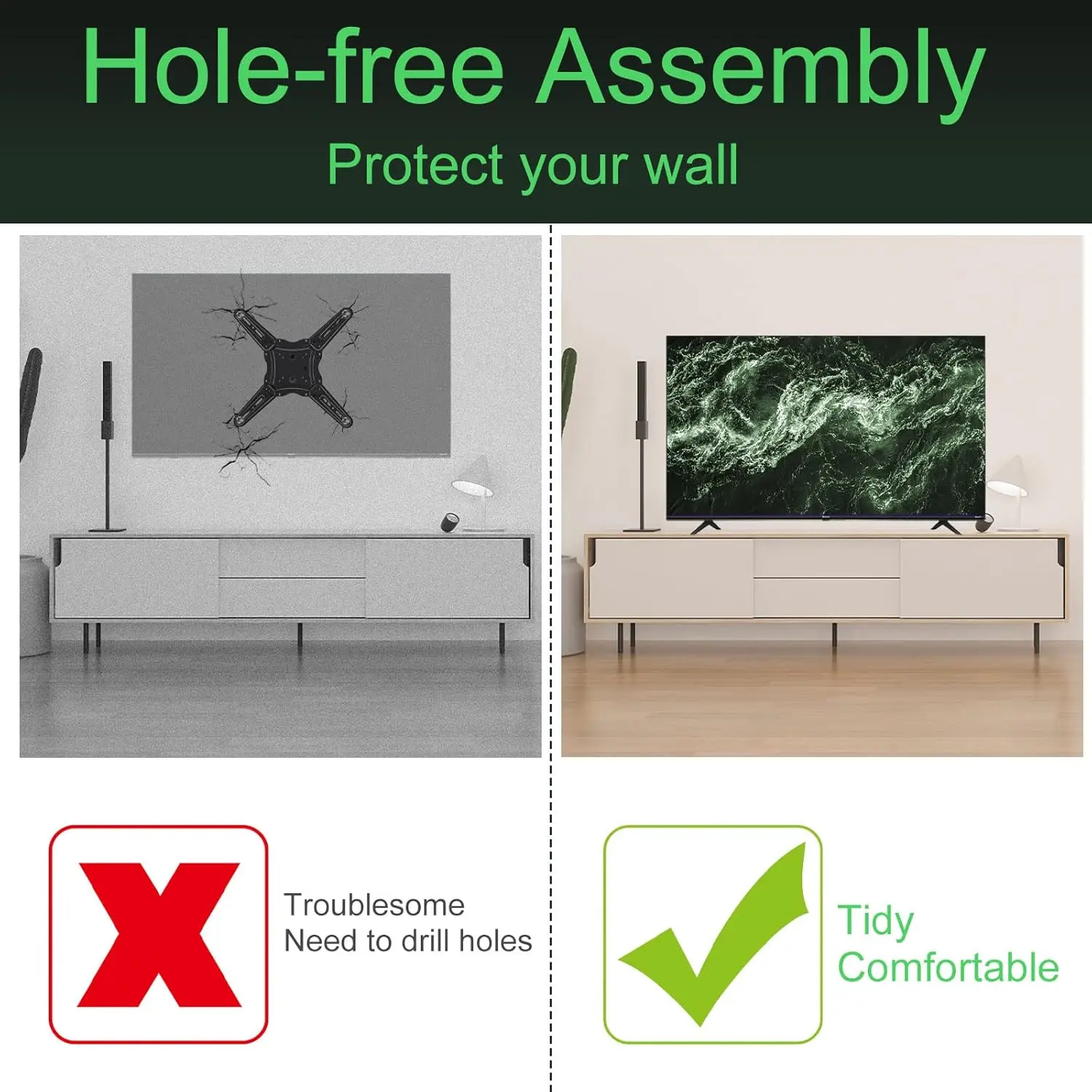 ---【No Need to Drill Holes】--- No need to drill holes with the TV base stand , no to the wall and keep your wall beautiful.