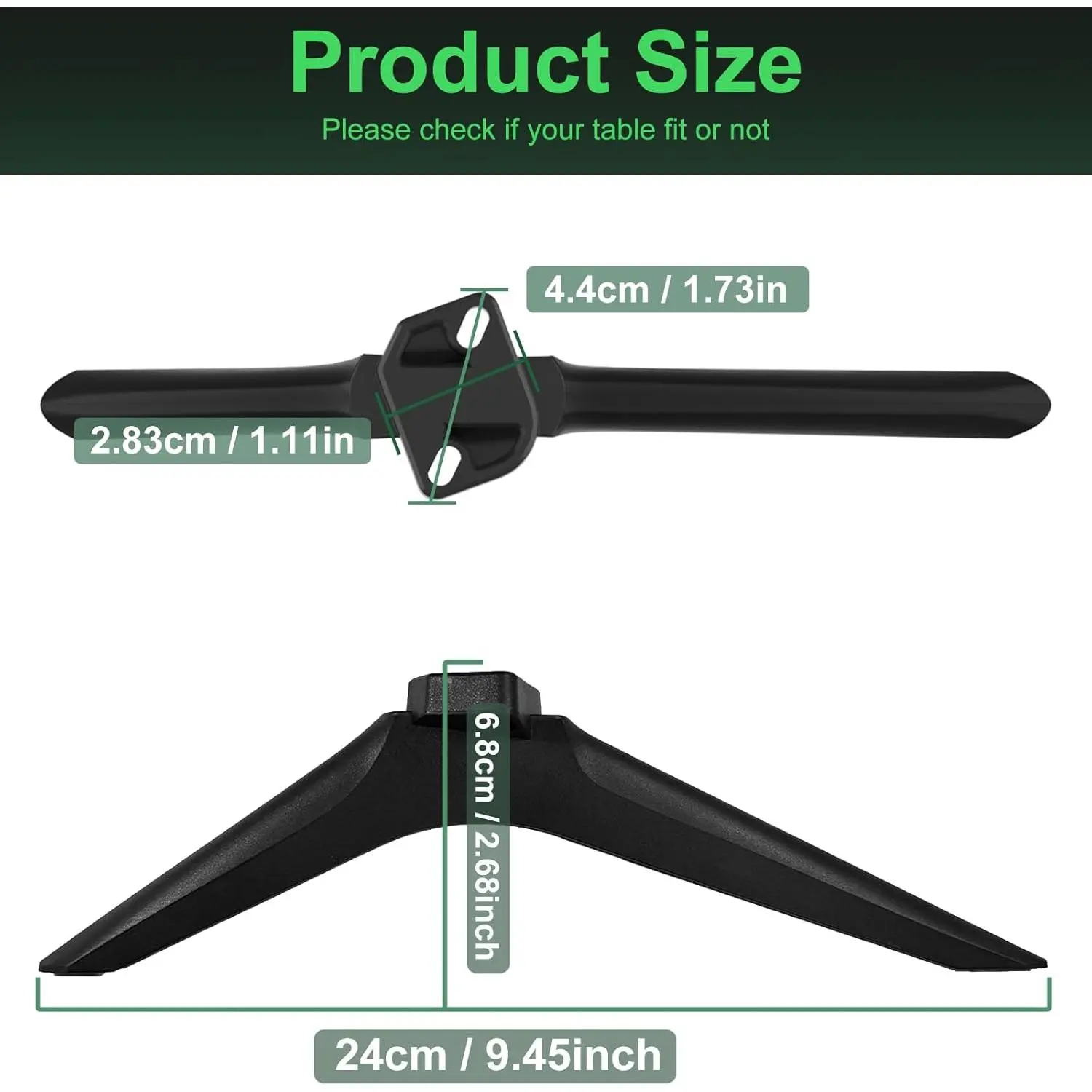 Important Notes: TV size -- 9.45in x 2.68in. Not TVs can use this . Not universal tv . Please confirm TV model, tv hole shape and measure distance before purchasing. Listed models are for reference only. Even if your model is included, differing bottom hole shape & distance mean incompatibility. If you find that the product you received is missing accessories, please tell , and we will send you the replacements.