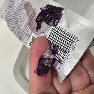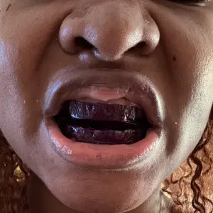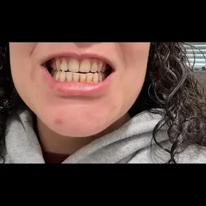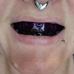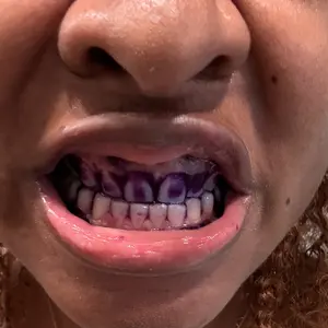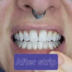Whiter teeth in one use. Simply apply, wait 30-minutes, peel & brush off the purple residue to reveal results.