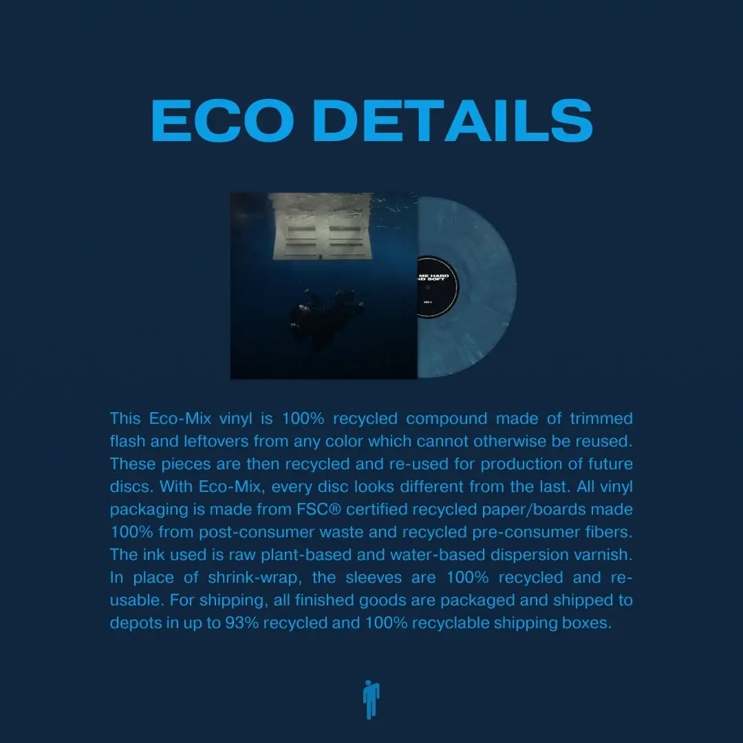 Eco Details: This Eco-Mix vinyl is 100% recycled compound made of trimmed flash and leftovers from any color which cannot otherwise be reused. These pieces are then recycled and re-used for production of future discs. With Eco-Mix, every disc looks different from the last. All vinyl packaging is made from FSC® certified recycled paper/boards made 100% from post-consumer waste and recycled pre-consumer fibers. The ink used is raw plant-based and water-based dispersion varnish. In place of shrink-wrap, the sleeves are 100% recycled and re-usable. For shipping, all finished goods are packaged and shipped to depots in up to 93% recycled and 100% recyclable shipping boxes.