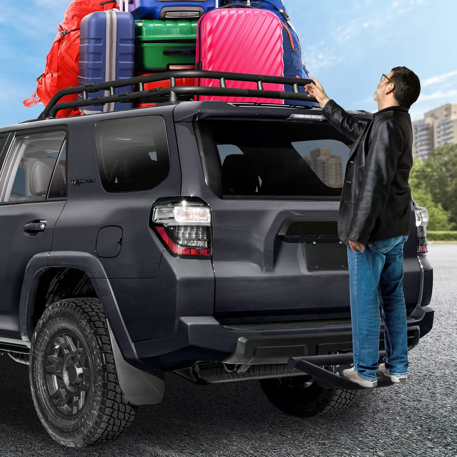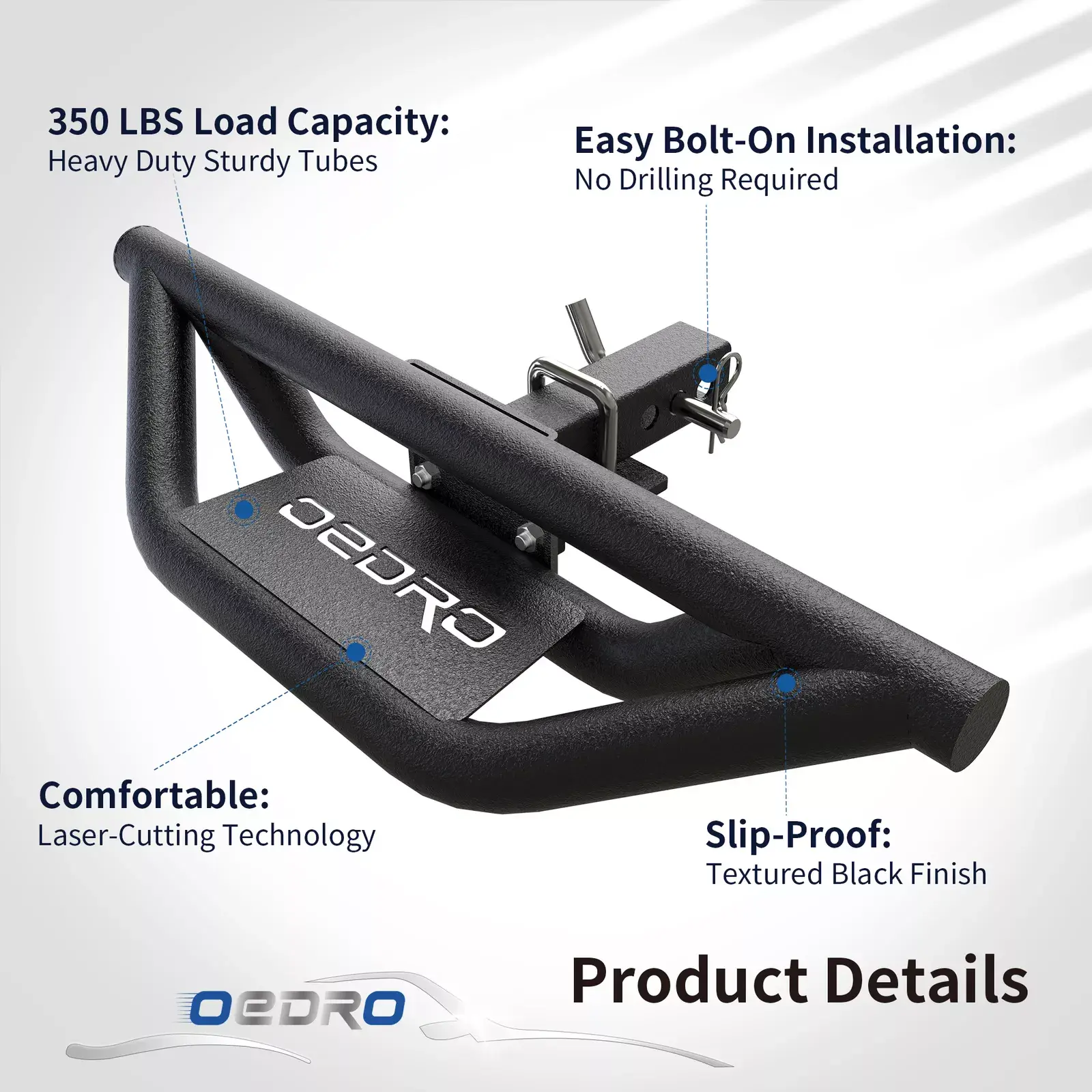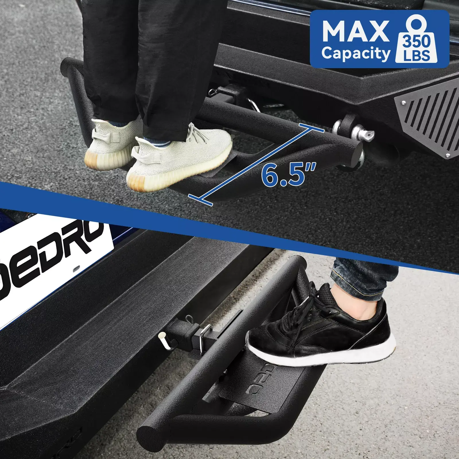 UNIQUE DESIGN - The innovative 3.5-inch drop step is ideal for vehicles with lift kits and oversized wheels,Hitch step is made of one-piece high-strength carbon steel, and uses a triangular structure to enhance stability and ensure safety during use