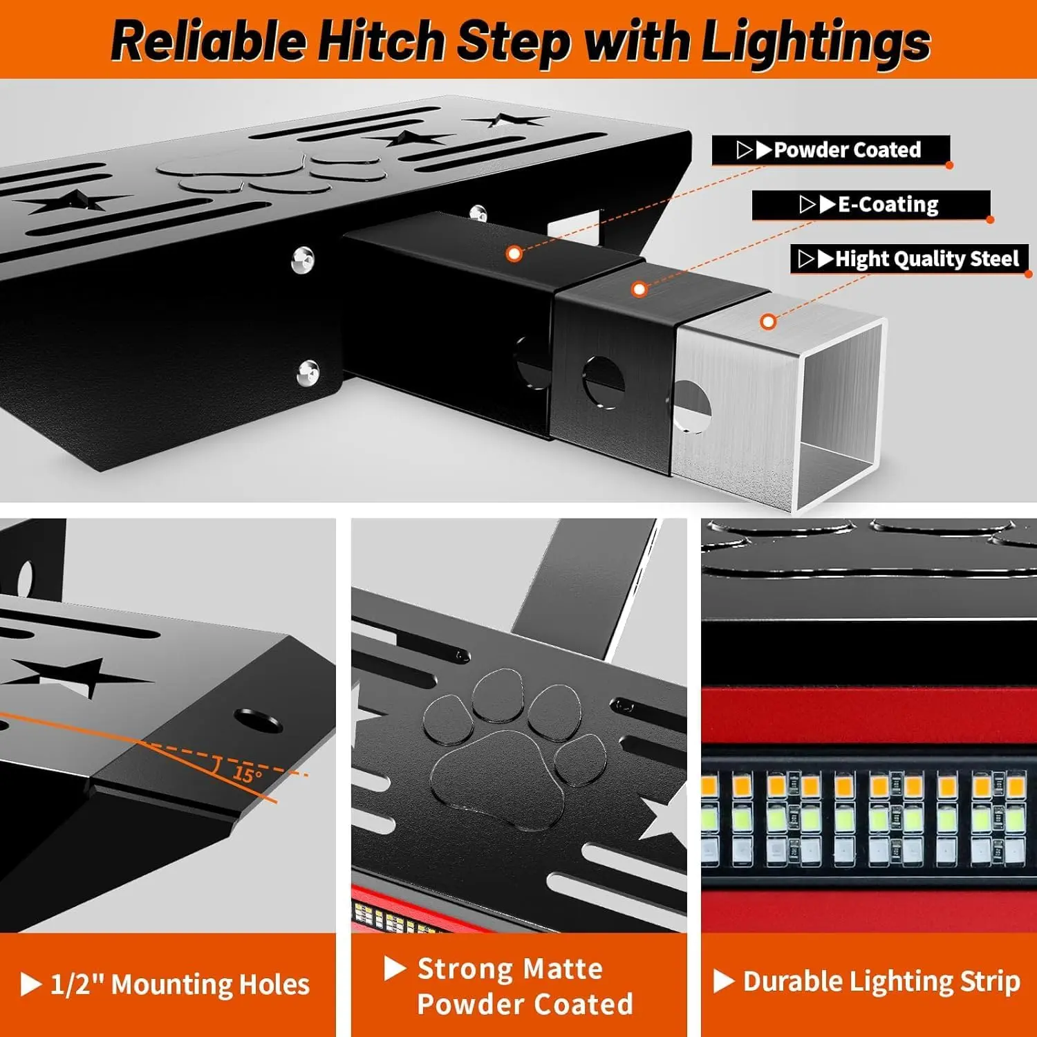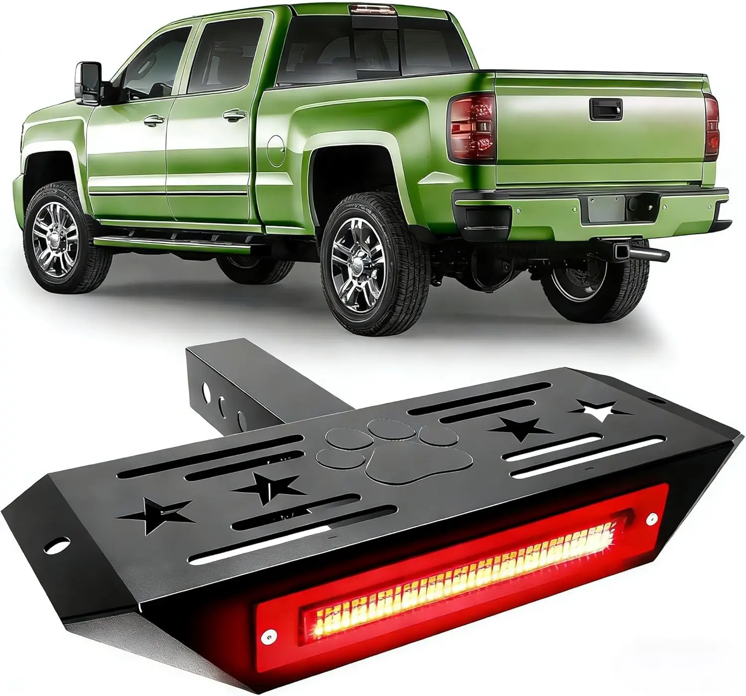 ·【Dual-Purpose Step & Light】This hitch-mounted step provides a stable platform to access your truck bed or roof, while the integrated 108-LED light bar enhances rear visibility with multiple lighting functions.