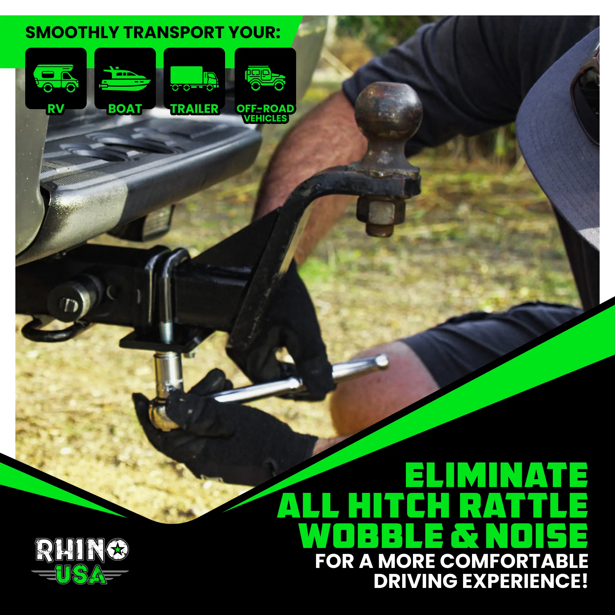 ·ELIMINATES HITCH MOVEMENT - Eliminates Hitch Noise, Rattle, and Wobble for a Quiet, Stable Ride. Secure Your Hitch with Rhino USA’s Hitch Tightener for a Safer, Smoother Towing Experience.