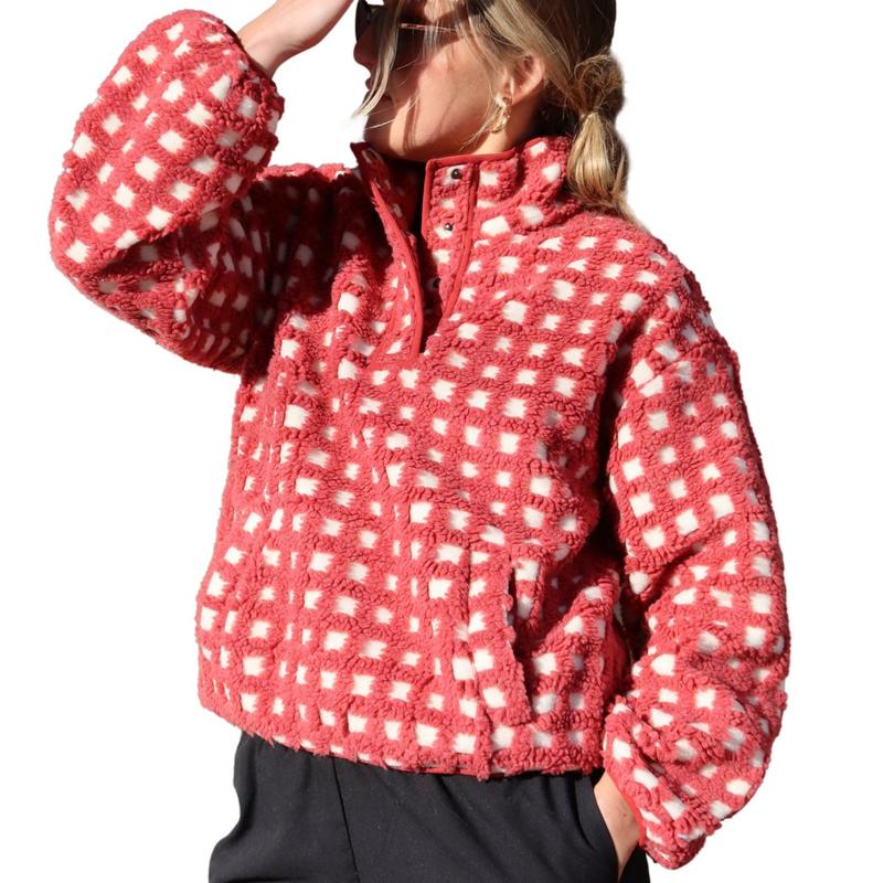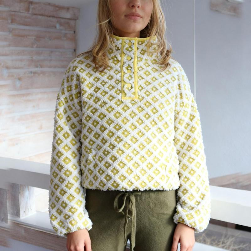Features: Fashionable oversized women's sportswear, long sleeves, plaid pullover, wool plaid hooded sweatshirt, loose fit, half button, high neck, front pocket, comfortable classic, double wool lining stand up neckline