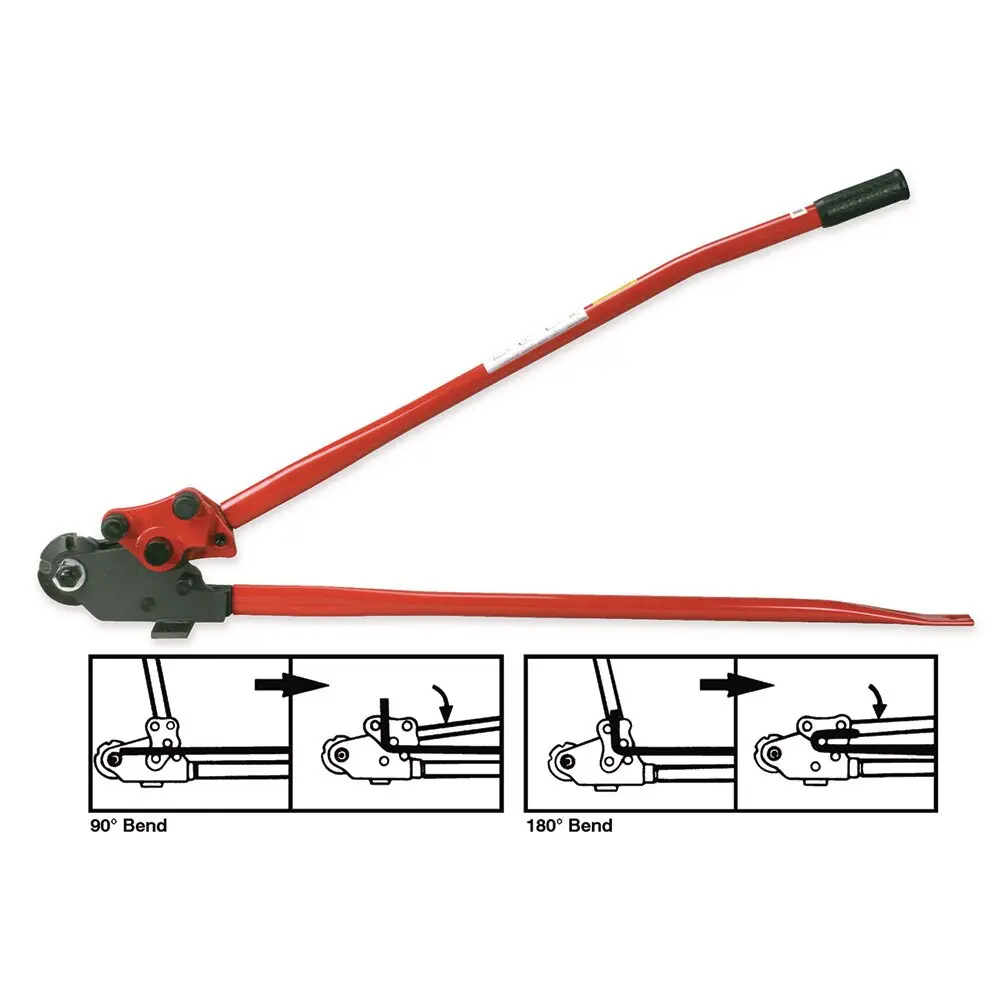 The H.K. Porter rebar cutter and bender is perfect for any job site where rebar needs to be cut to length or bent to fit into forms. The tool's shear cutting head is capable of cutting and bending up to 5/8-inch thick (#5) steel rebar. Cutting head and lower bar are designed to be easily mounted to a bench or work station allowing for increased leverage.