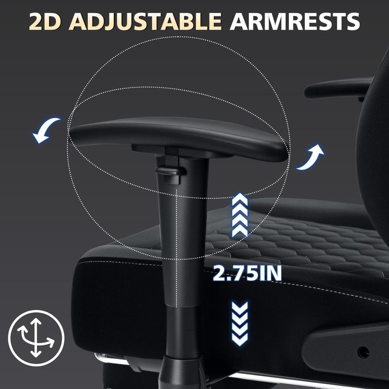 • Fully Ergonomic & Adjustable 2D armrests, 90°–165° recline, pull-out footrest, and 5° rocking mode—work, game, or relax your way.