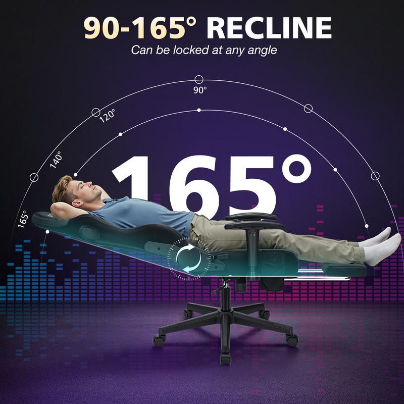 • Fully Adjustable Ergonomics 2D armrests, 90°–165° recline, pull-out footrest, and 5° rocking mode for work or play.