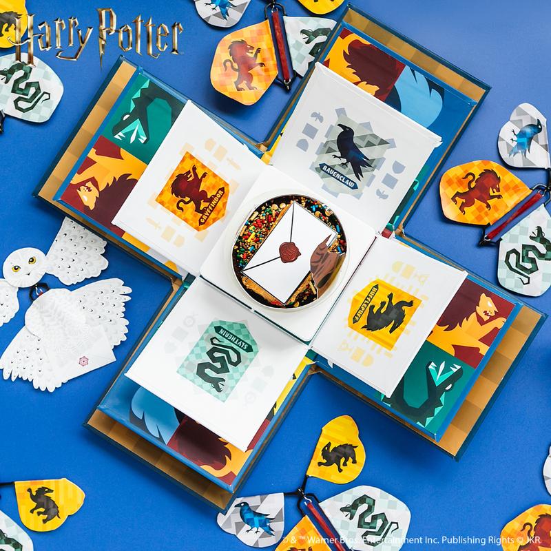 - Chocolate Cake: Decorated with sprinkles, topped with an edible envelope, and wrapped with a Sorting Hat band. It’s a 3-inch round cake.