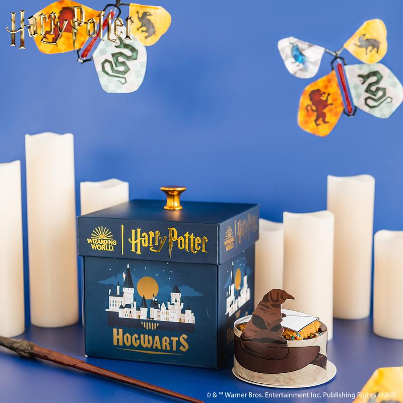 The ideal gift for witches, wizards, and Muggles! This officially licensed box mimics Hogwarts' first-day excitement. It features a flurry of house crests and Hedwig, greeting the recipient. Join the celebration with music, lights, and a chocolate cake filled with candies. It’s a magical surprise experience they’ll cherish.