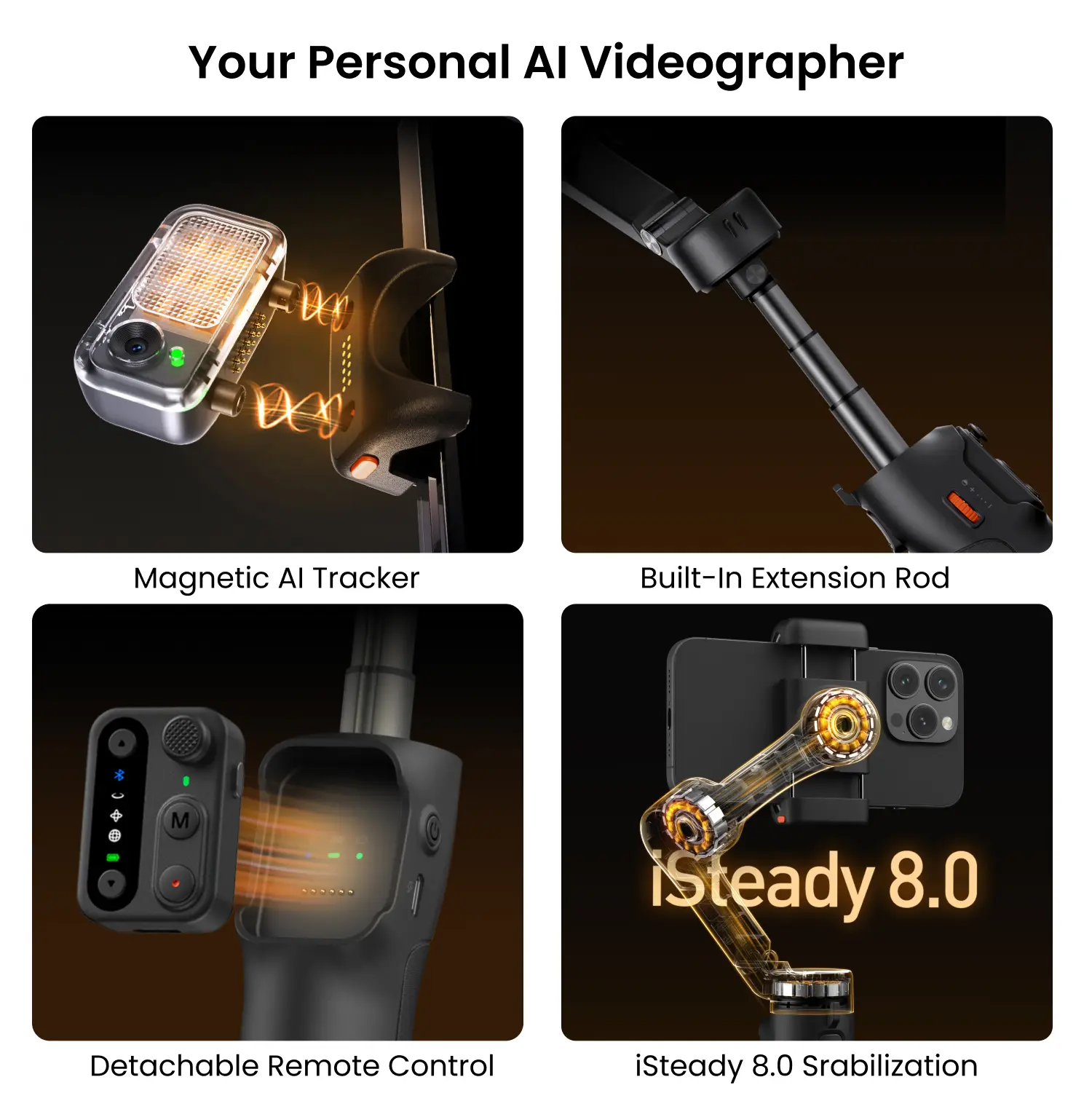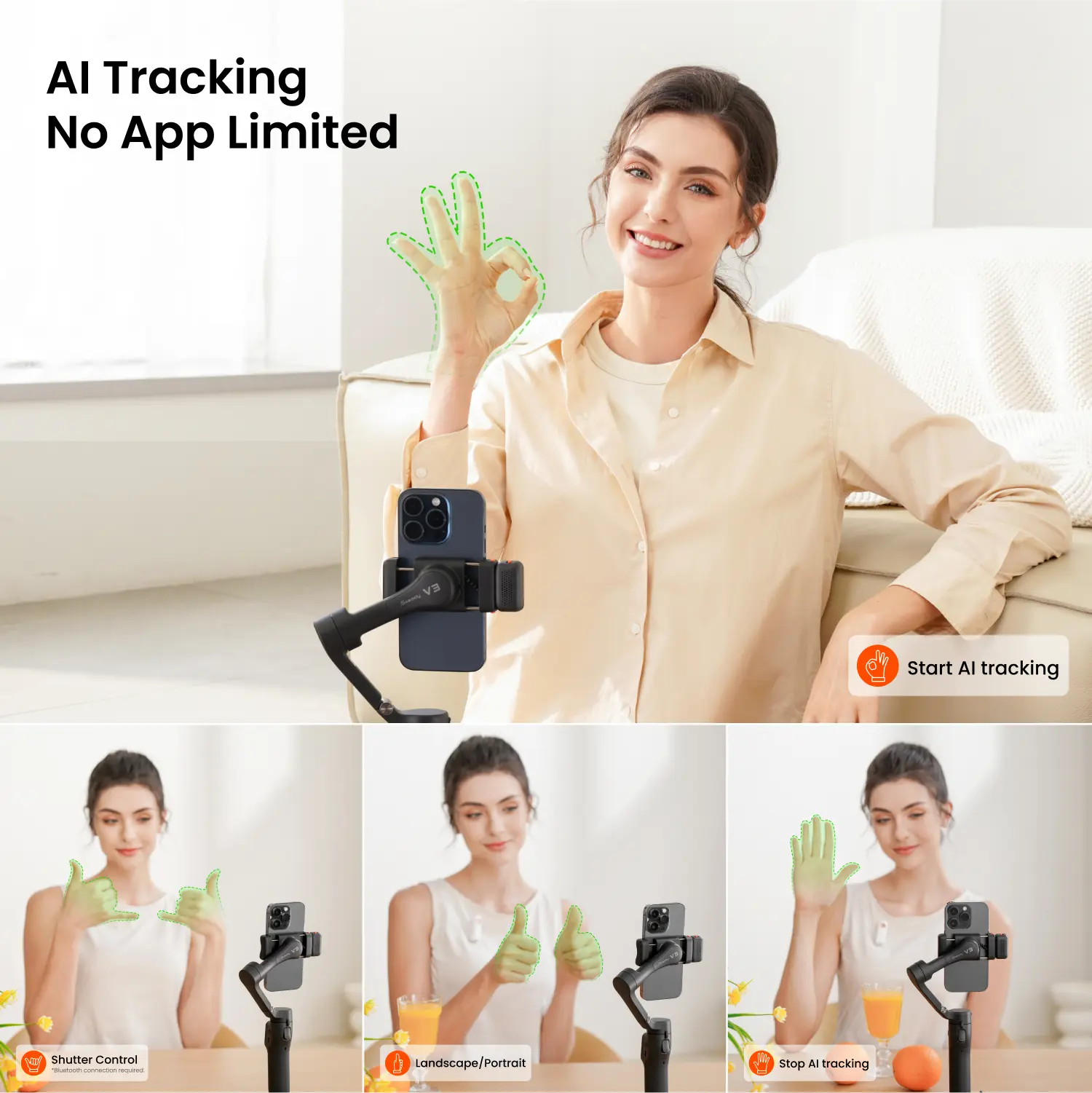 1.AI Tracking Device:The 2024 Upgraded hohem iSteady V3 Gimbal features a magnetic AI tracker for smooth, face and body tracking without the need for the app, ensuring stable shooting. Activate or deactivate the gimbal’s AI vision sensor with specific gestures to maintain your subject in frame. Perfect for travel bloggers seeking to effortlessly capture every moment.