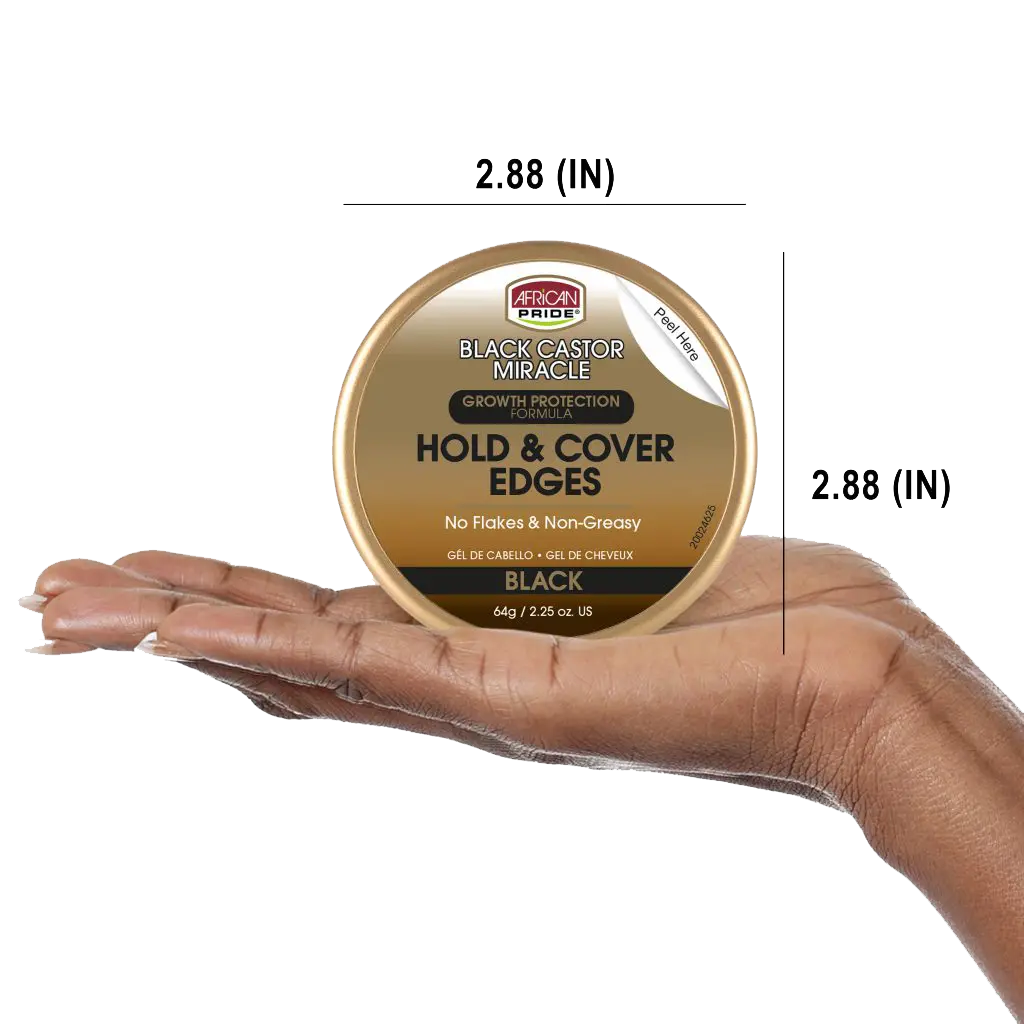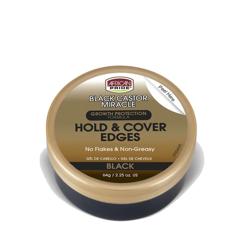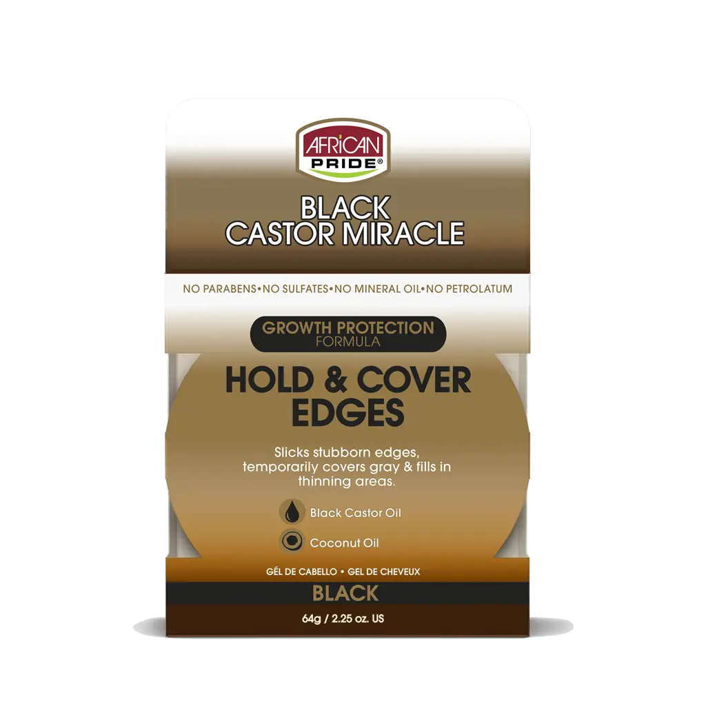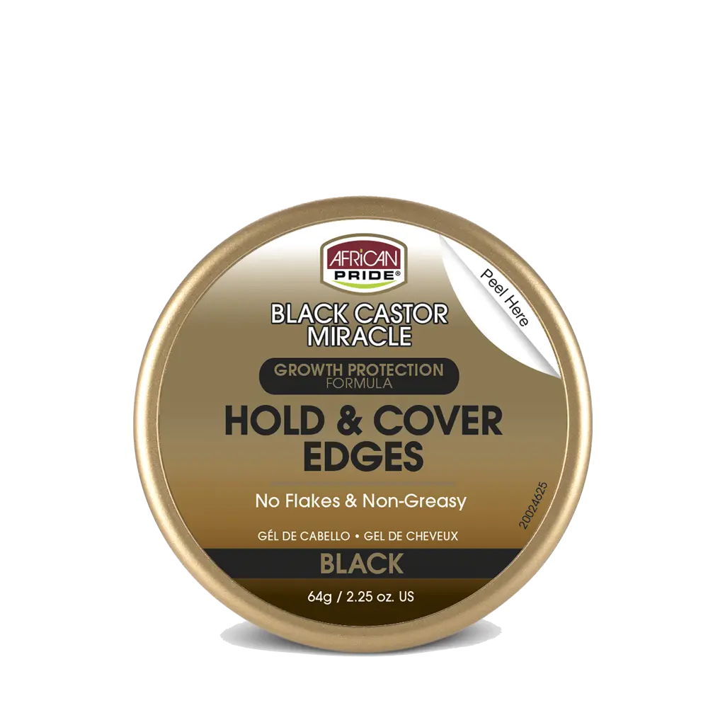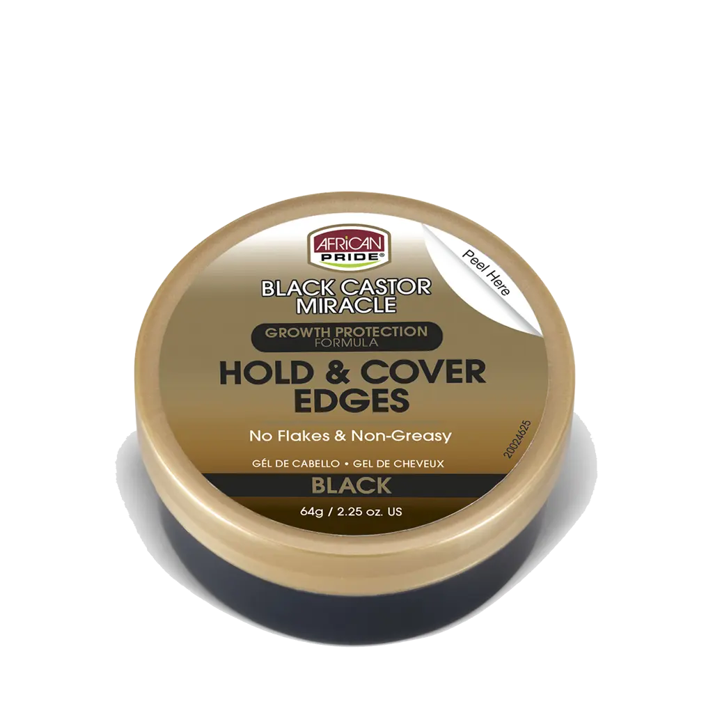 African Pride Black Castor Miracle Hold & Cover Edges slicks stubborn edges, temporarily covers gray & fills in thinning areas. Better than a spray, this gel provides coverage without flakes or a greasy appearance. No flakes, non-greasy.