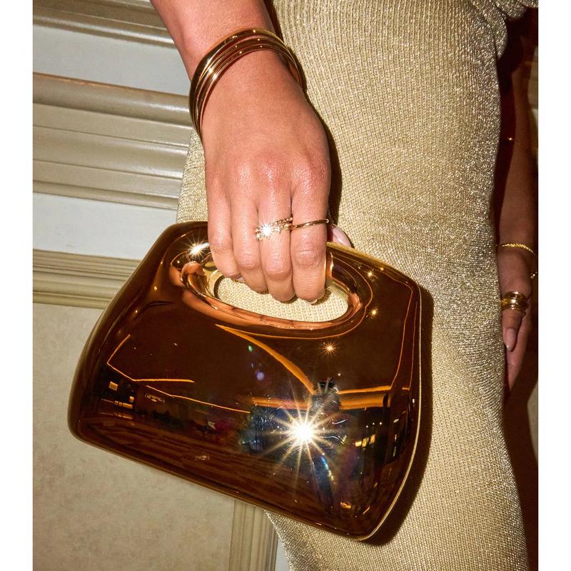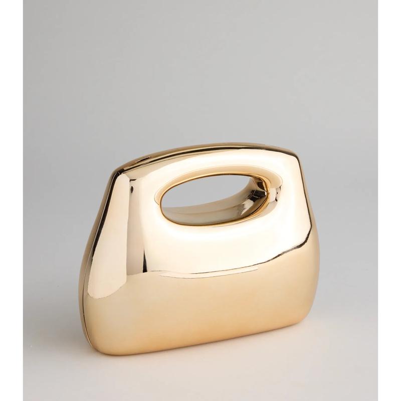 This sculptural acrylic metallic mini bag shines bright with a built-in top handle and sleek chain strap—perfect for dressing up your look!