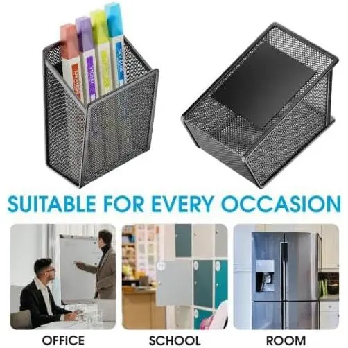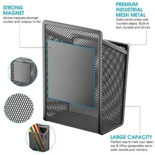 MAGNET UPGRADE: A large magnet on the back of each magnetic pen holder replaces the original small magnet, which improves the two problems of magnet falling off and insufficient magnetism, to ensure that the pencil holder will not fall when storing items. SIZE: 5'' x 3.6'' x 3.5'', single pack, you can use this magnetic pen holder at the same place, also can attach them to different places, or just put it on the table as a regular pen holder. SIMPLE & USEFUL: This magnetic pen holder is easy to store and organize office or school supplies, such as PENCILS, PENS, MARKERS, KEYS, ETC., which will greatly save space and keep the environment tidy. MULTIFUNCTIONAL: This locker accessories is perfectly designed for multiple scenes, use it when you need a pen holder in the classroom, as a unique organizer on your fridge for small items or even in the gym locker for keys, etc.
