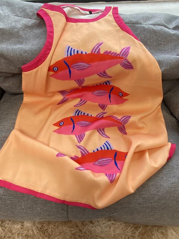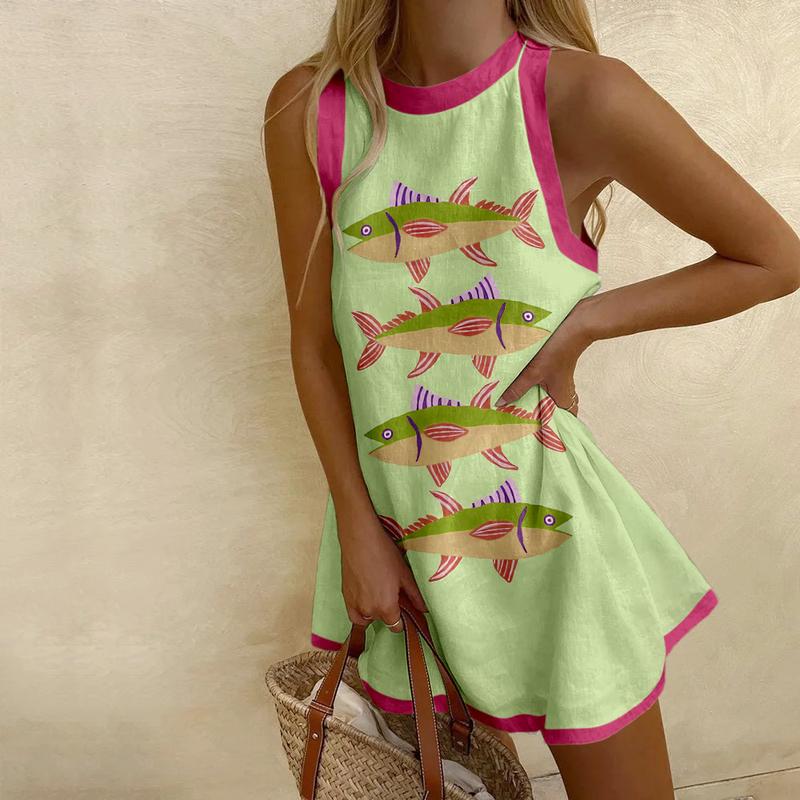 The Pop style emerged in the 1950s, inspired by cultural symbols. It features bright, saturated colors, repetitive patterns, and exaggerated shapes. This dress uses a flat fish group pattern with strong contrast and a bright tone. A vertical layout is adopted, creating a playful look. Perfect for summer seaside vibes.