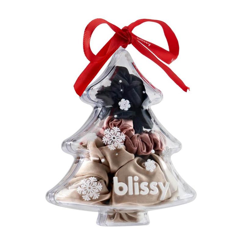 Ring in the holidays with festive elegance with the Blissy Holiday Ornament. This eye-catching, clear Christmas tree features delicate snowflakes and the signature Blissy logo, making it a chic addition to your holiday decor. Inside, find a trio of luxurious Blissy scrunchies to glam up your holiday hairstyles. Included are a silk scrunchie in Champagne, along with two skinny scrunchies in Black and Rose Gold.