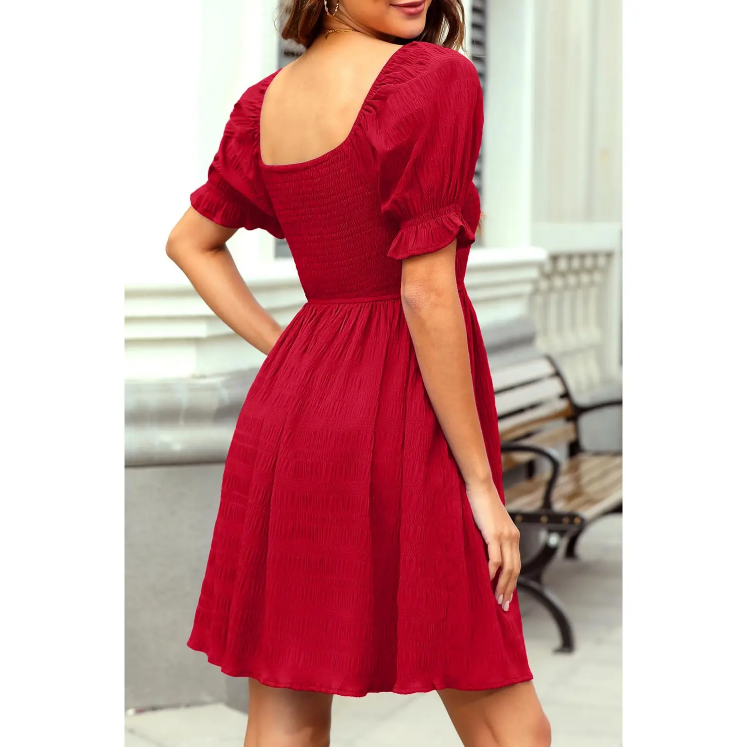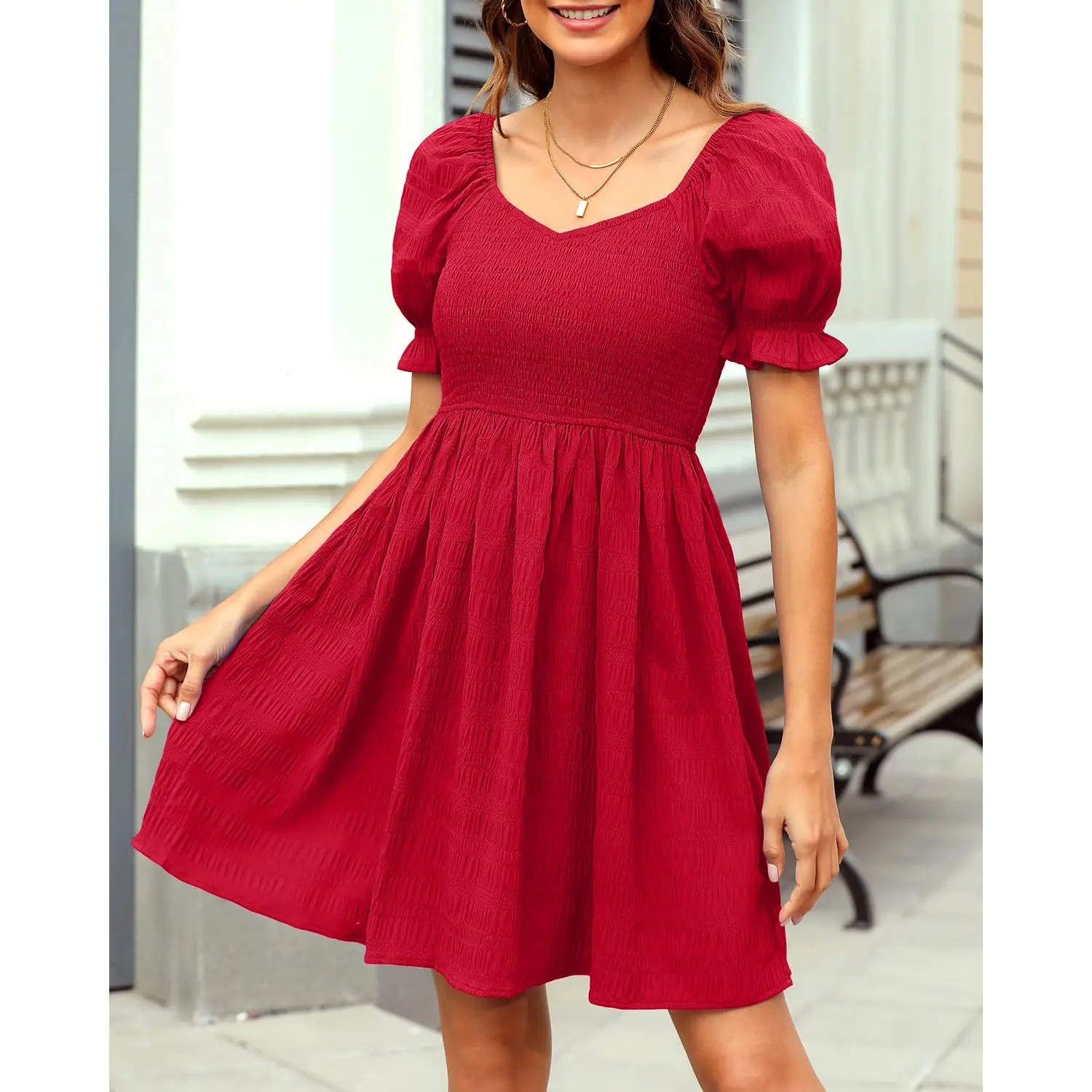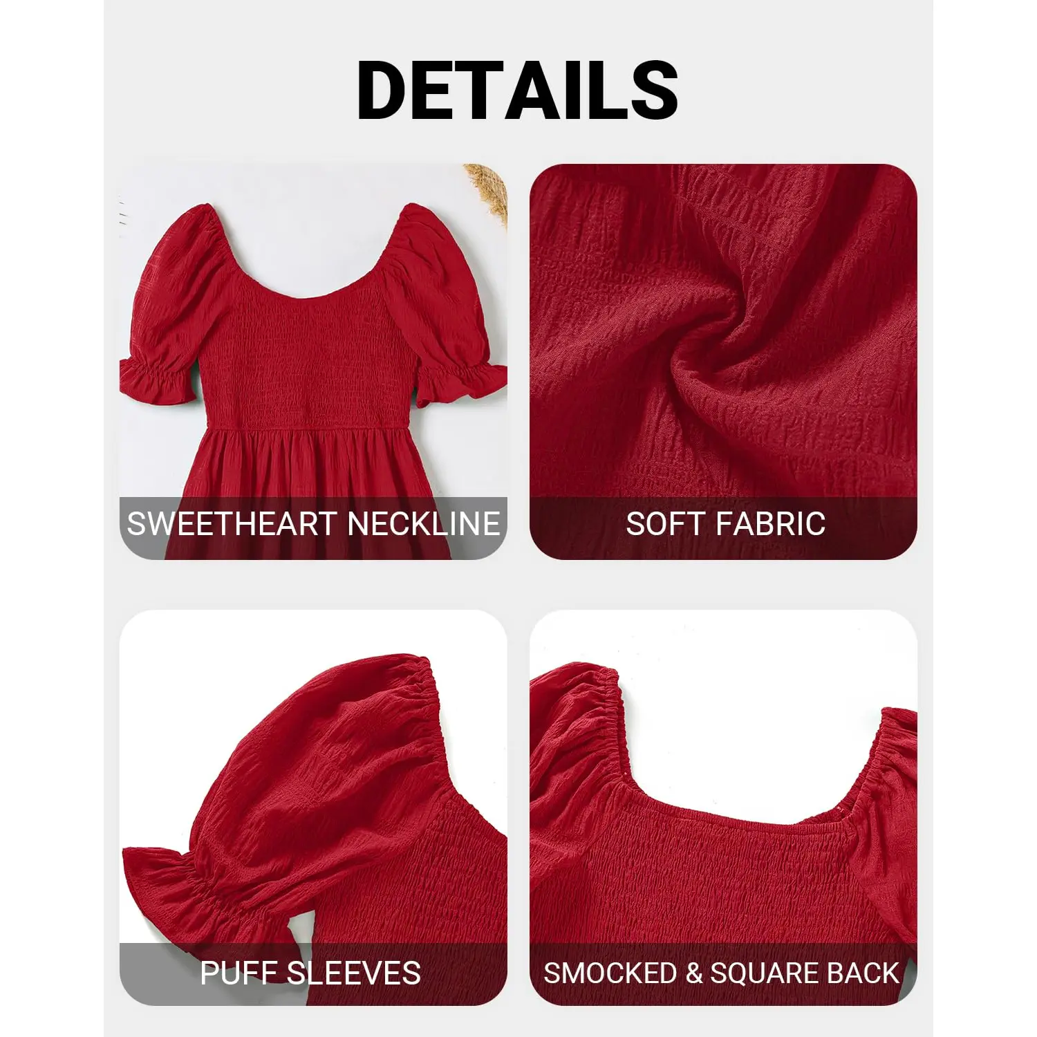 ·Sweetheart Neckline and Puff Sleeve Design: This casual dress boasts a sweetheart neckline and puff sleeves. Its square back neckline, combined with an A - line short - dress silhouette, gives it a charming look. The smocked design on the chest and back not only accentuates your curves but also provides some stretch for a comfortable fit.