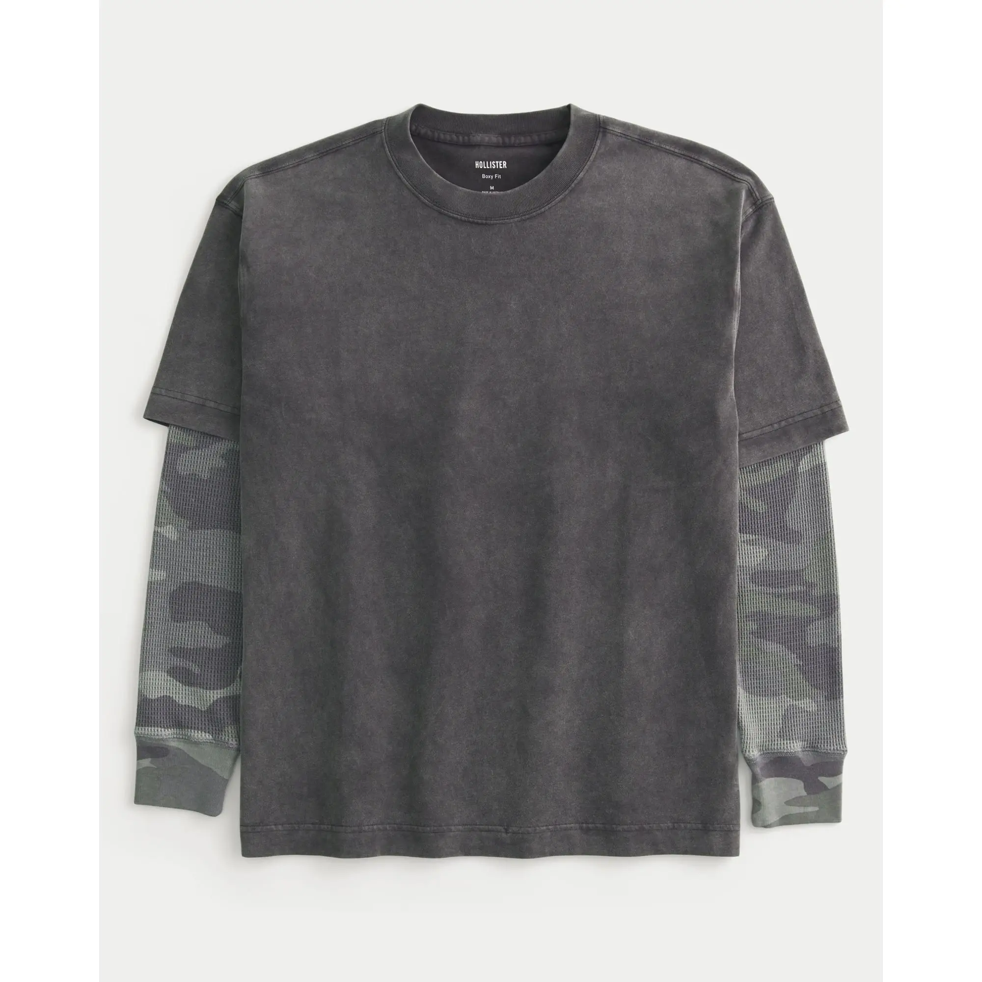 Comfortable and super soft, this t-shirt features long-sleeve thermal waffle sleeves for a layered look. Washed look, crew neckline. Boxy Fit. Imported.