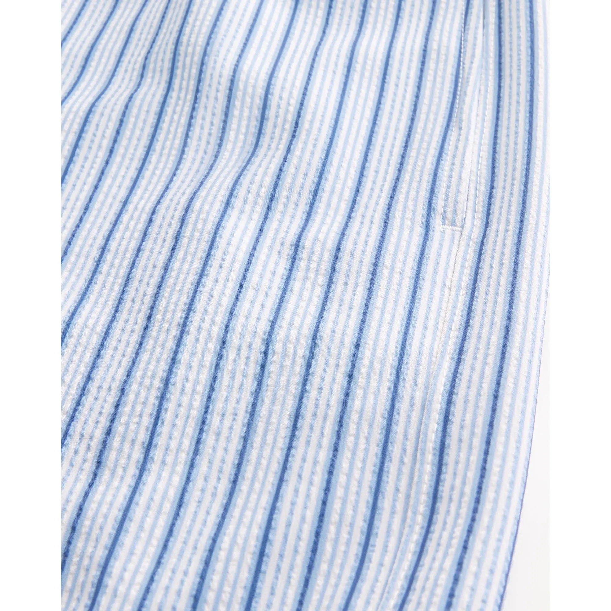 Shorter-length swim trunks that hit mid-thigh. Featuring comfortable 4-way stretch seersucker swim fabric and a 5 1/2 inseam. Front pockets, mesh lining, drawstring waist. Imported.