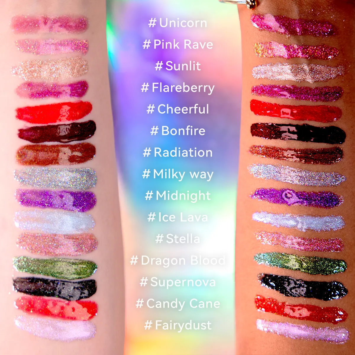 Tired of Choosing between a dazzling shine and comfortable wear? Our ultra-glitter liquid lip gloss delivers an explosive, 3D prismatic shine, it also provides you with the best hydrating experience to your lips. Get ready for a lip look thatโs as radiant as it is nourished.