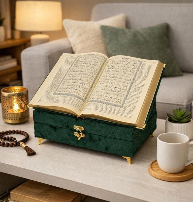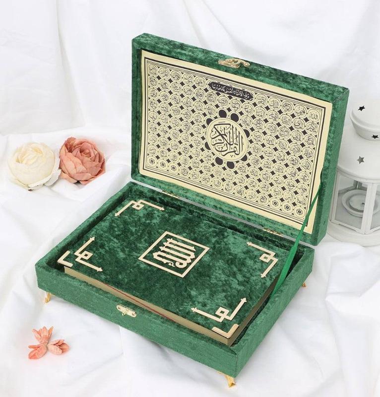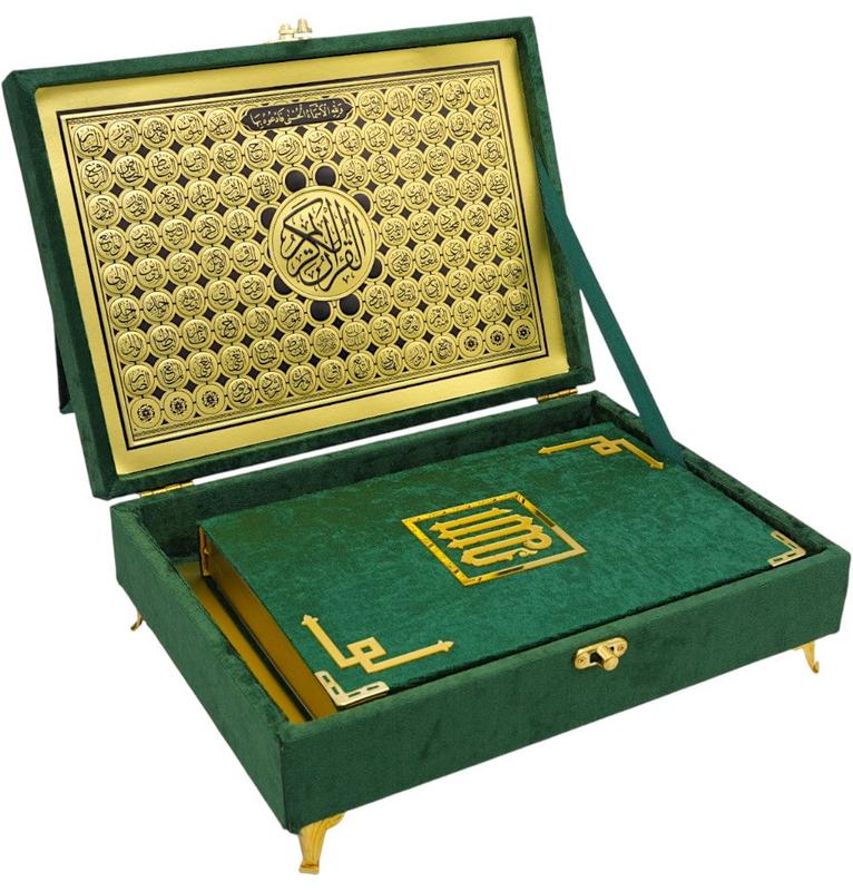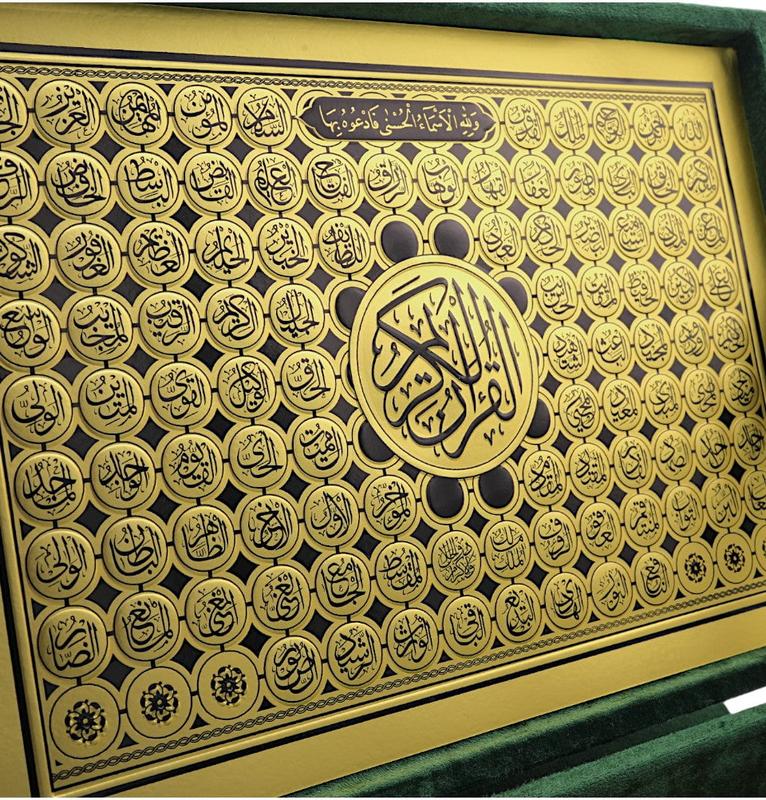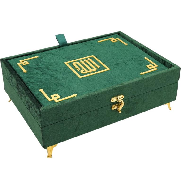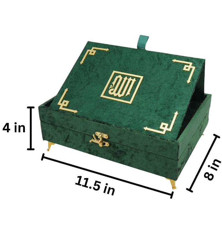 Holy Quran Keepsake Beyza Gift Set - Green Looking for a great Islamic gift, look no further! This Islamic Quran Keepsake is traditional with a touch of contemporary! The top features in beautiful Kufic calligraphy, "Allah" in gold acrylic with a square border and modern edges. The top of the velvet-covered box pops up for display which can also be used as a rahle (Quran holder). Inside the top of the box has a beautiful detailed art of Allah's 99 names in gold and black making it the perfect reminder when propped up. The Quran can be stored inside the velvet lined box. This keepsake is beautiful, unique and the perfect gift for any special occasion. FEATURES