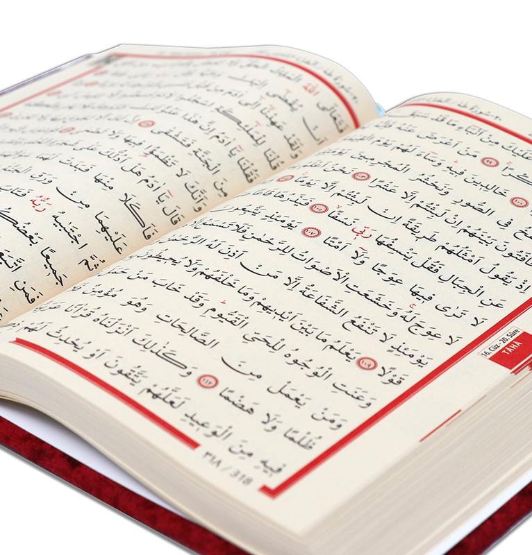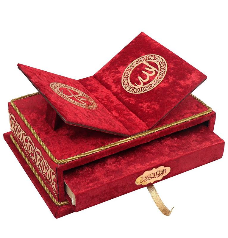 This Keepsake Quran make a unique gift! The top of the velvet-covered box opens up to become a rahle (Quran holder). Quran is stored within the box and slides out when you pull on the ribbon.