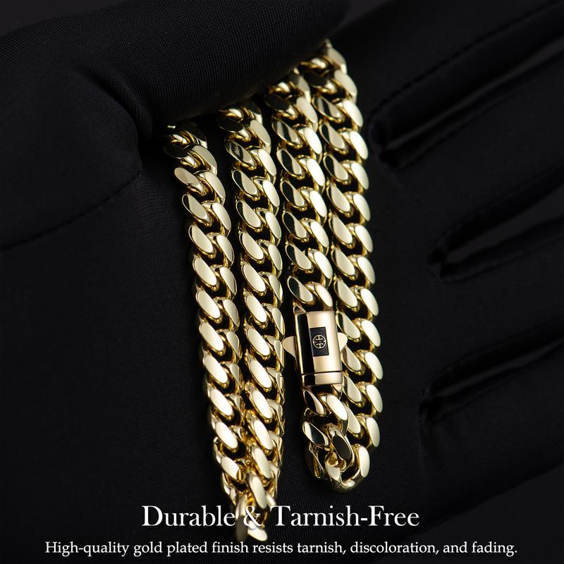 Royal Monaco Cuban Necklace de HolyLegend con baño de oro real de 14K y diseño cubano clásico de inspiración italiana. Cadena elegante y resistente para uso diario, ideal para hombres y mujeres que buscan una cadena de calidad, con brillo duradero y estilo atemporal. Disponible en diferentes anchos para usar sola o en layering. #CubanNecklace #GoldPlatedChain #MensJewelry #HolyLegend #TikTokShop