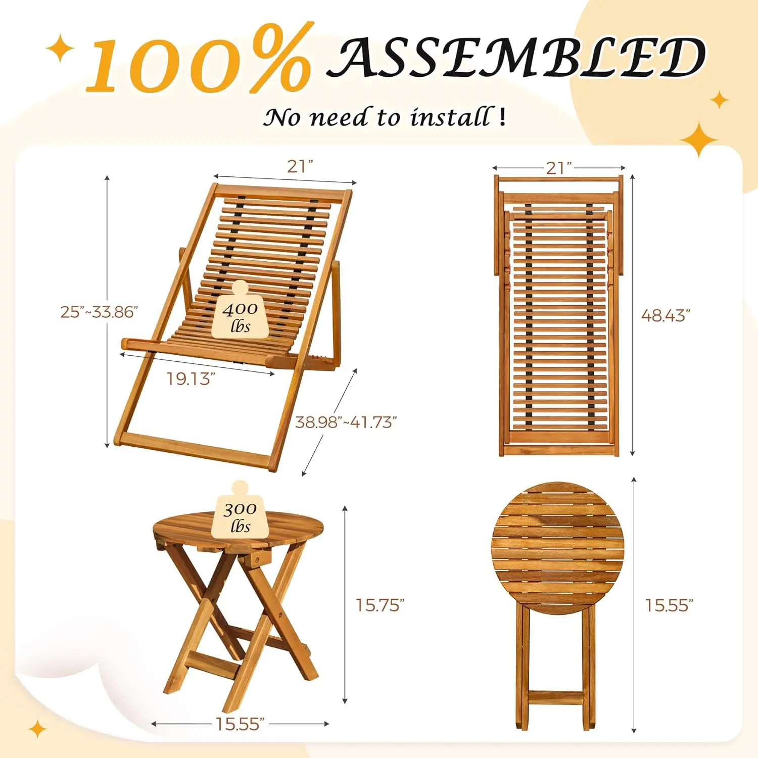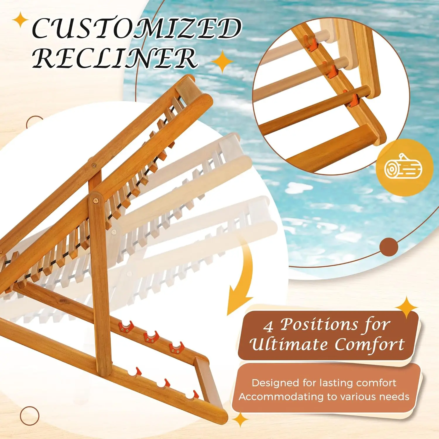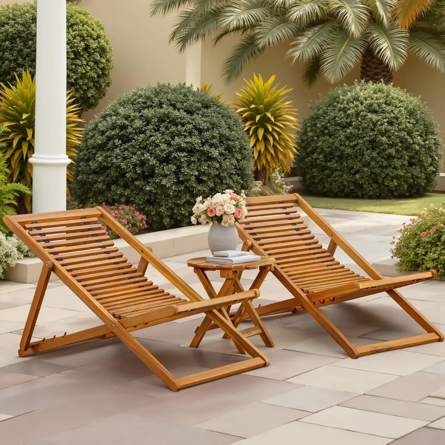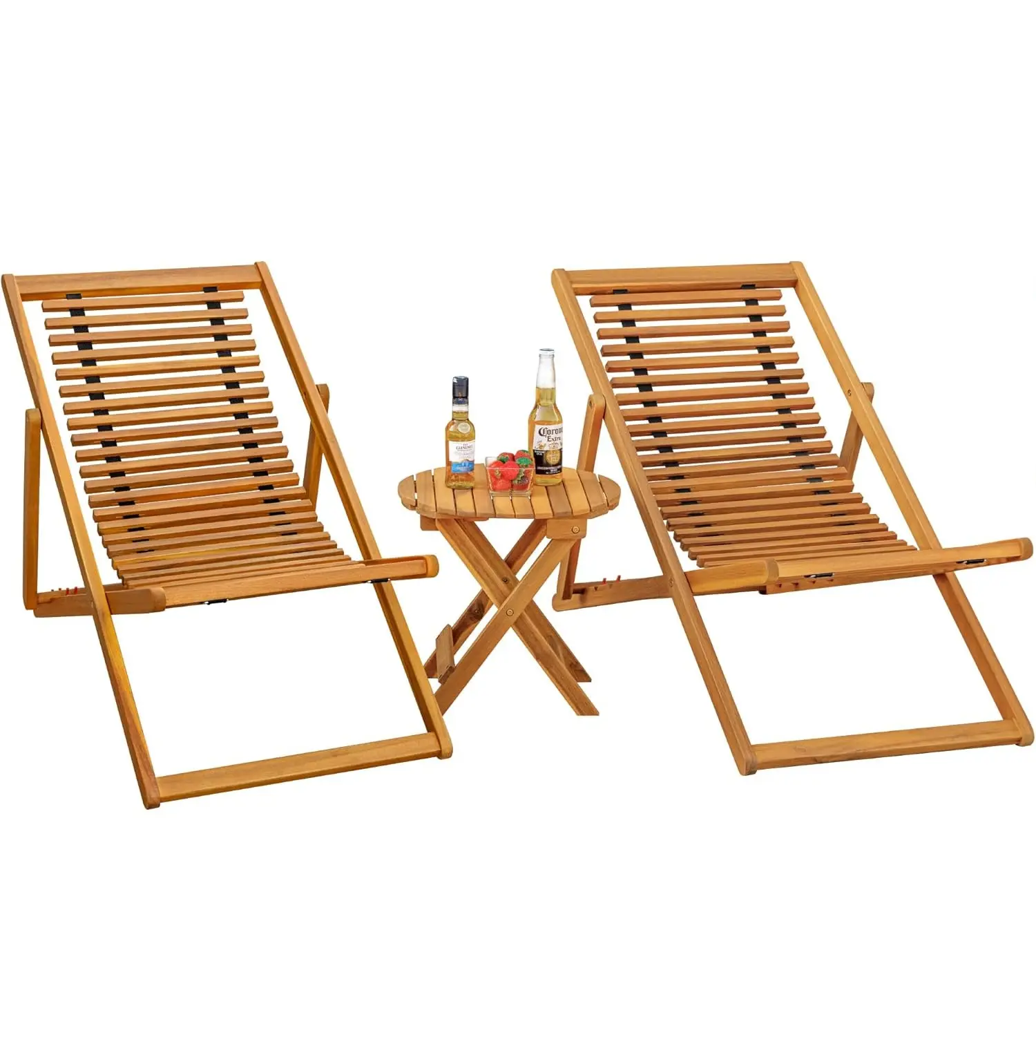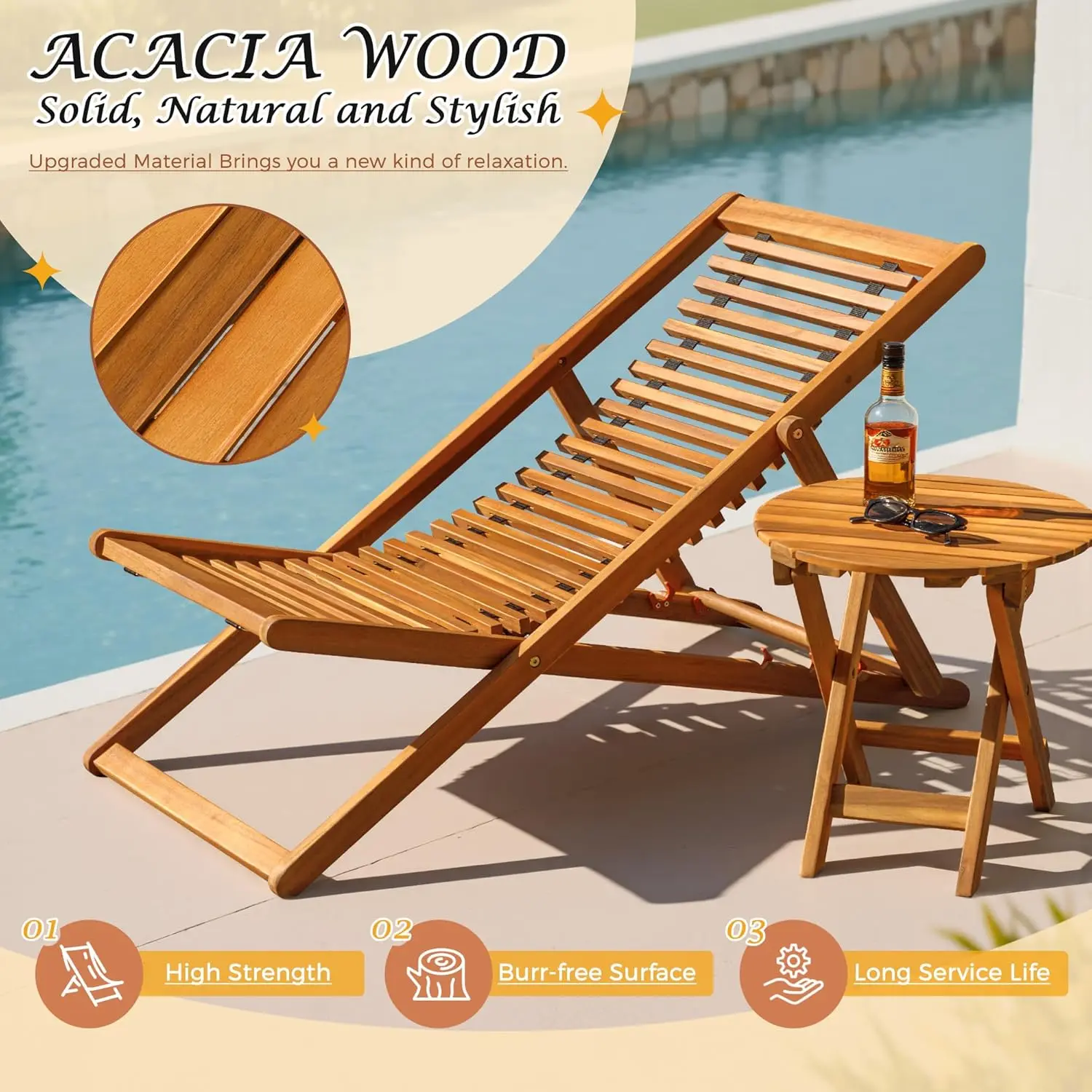 Elevate outdoor relaxation with a 100% Acacia wood chaise set—weather-resistant, adjustable for comfort, foldable for portability, and ready to use anywhere from beaches to patios, no assembly needed.