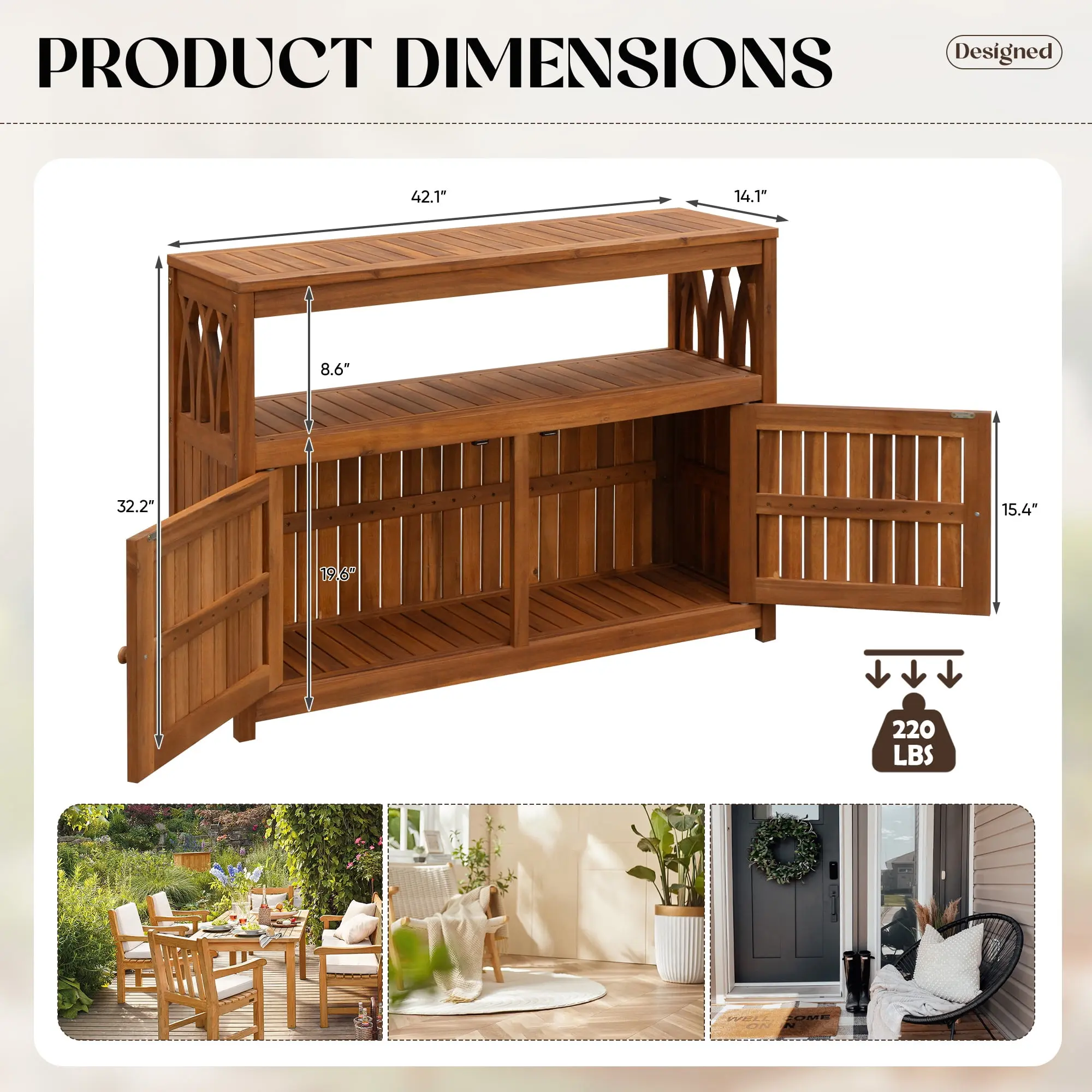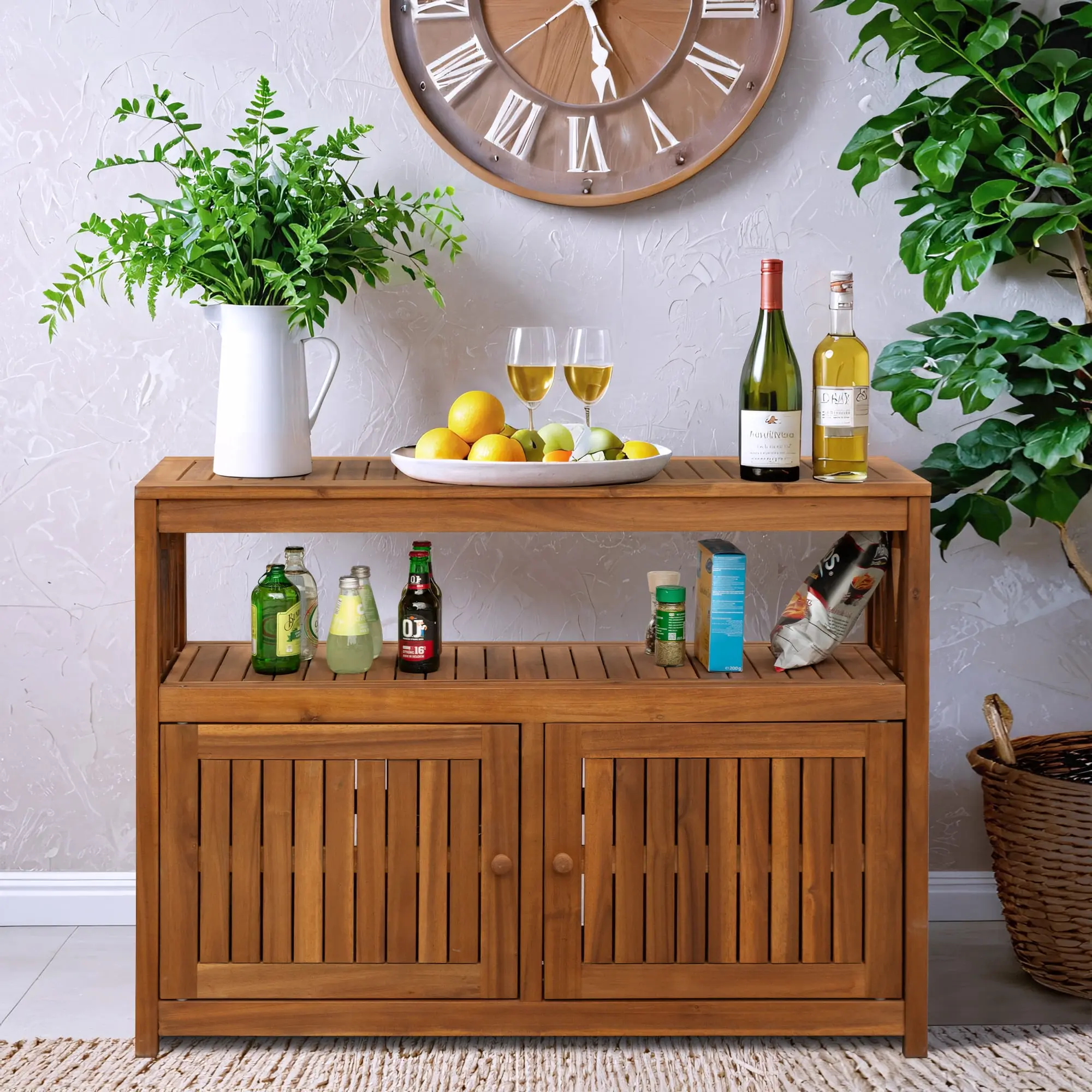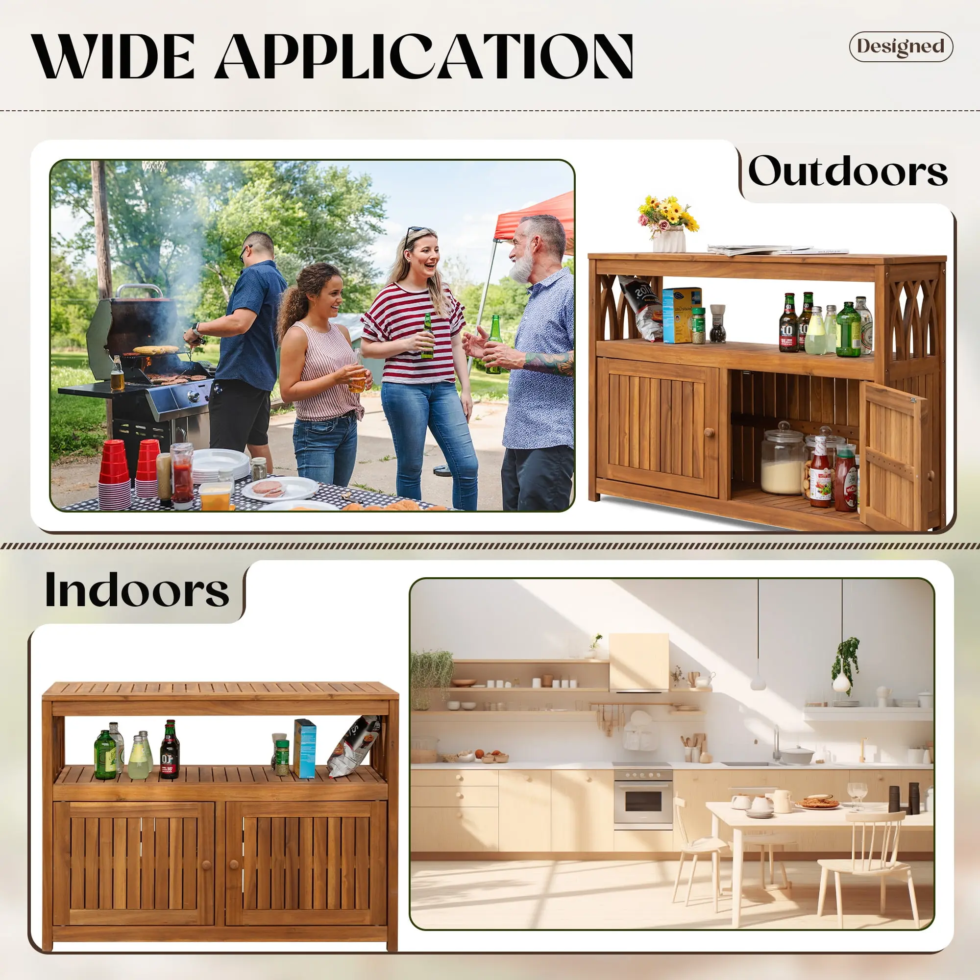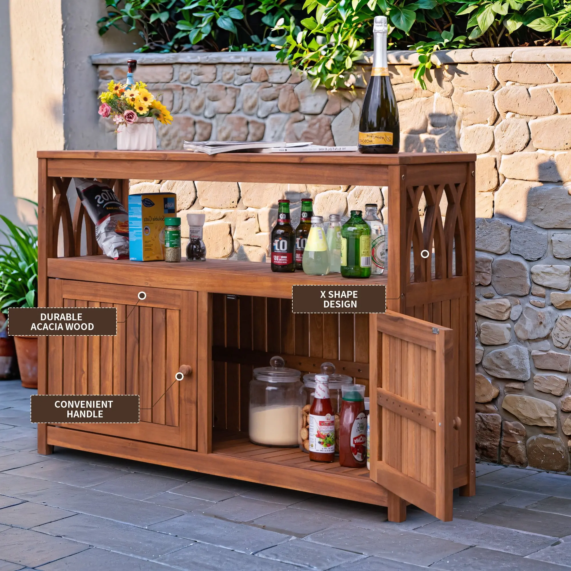 LARGE STORAGE SPACE: Featuring a 3-tier storage design with multiple storage spaces, storage can be flexibly arranged, this acacia wood kitchen cabinet provides a large storage space for some wine bottles, spice jars, cutlery, food, pots and pans.