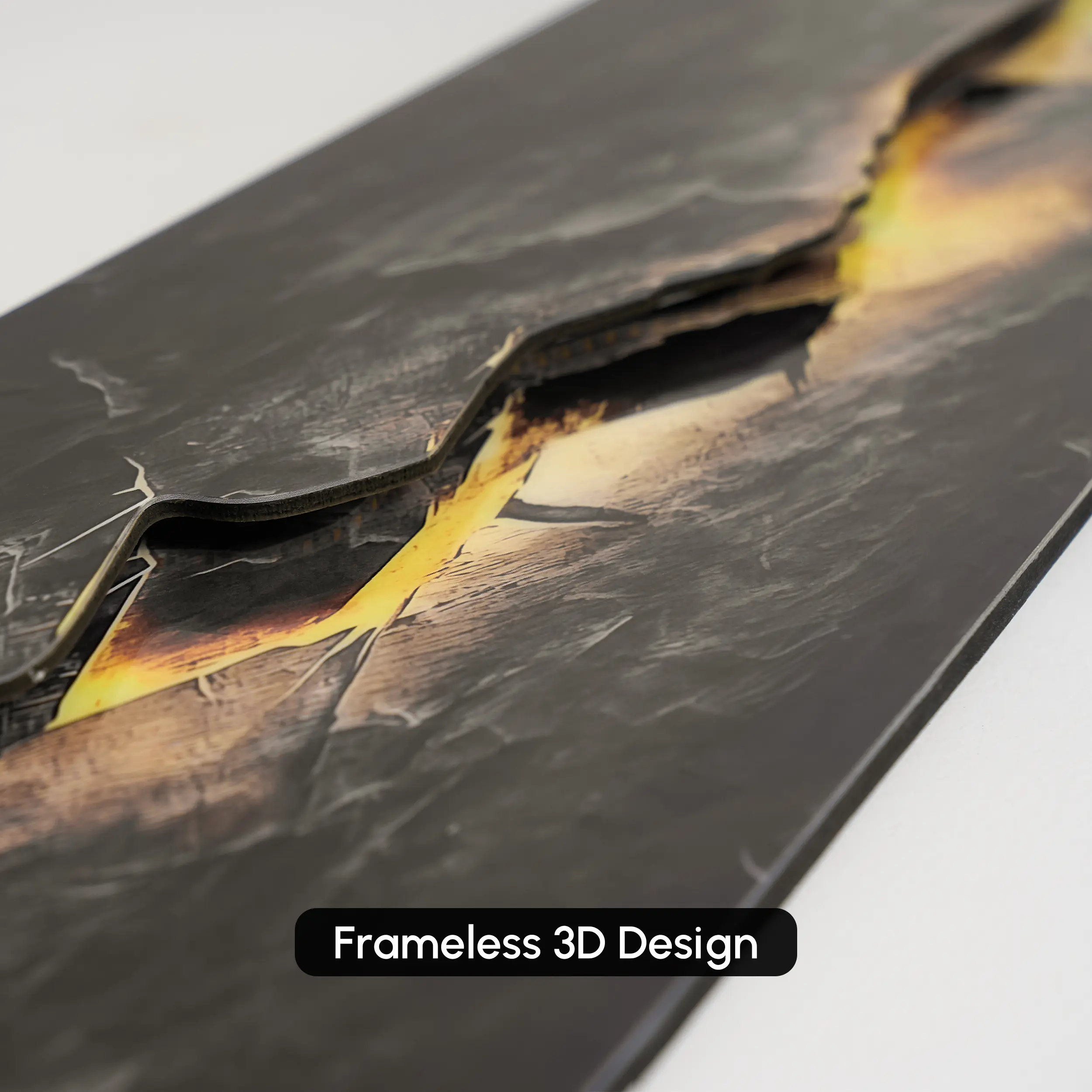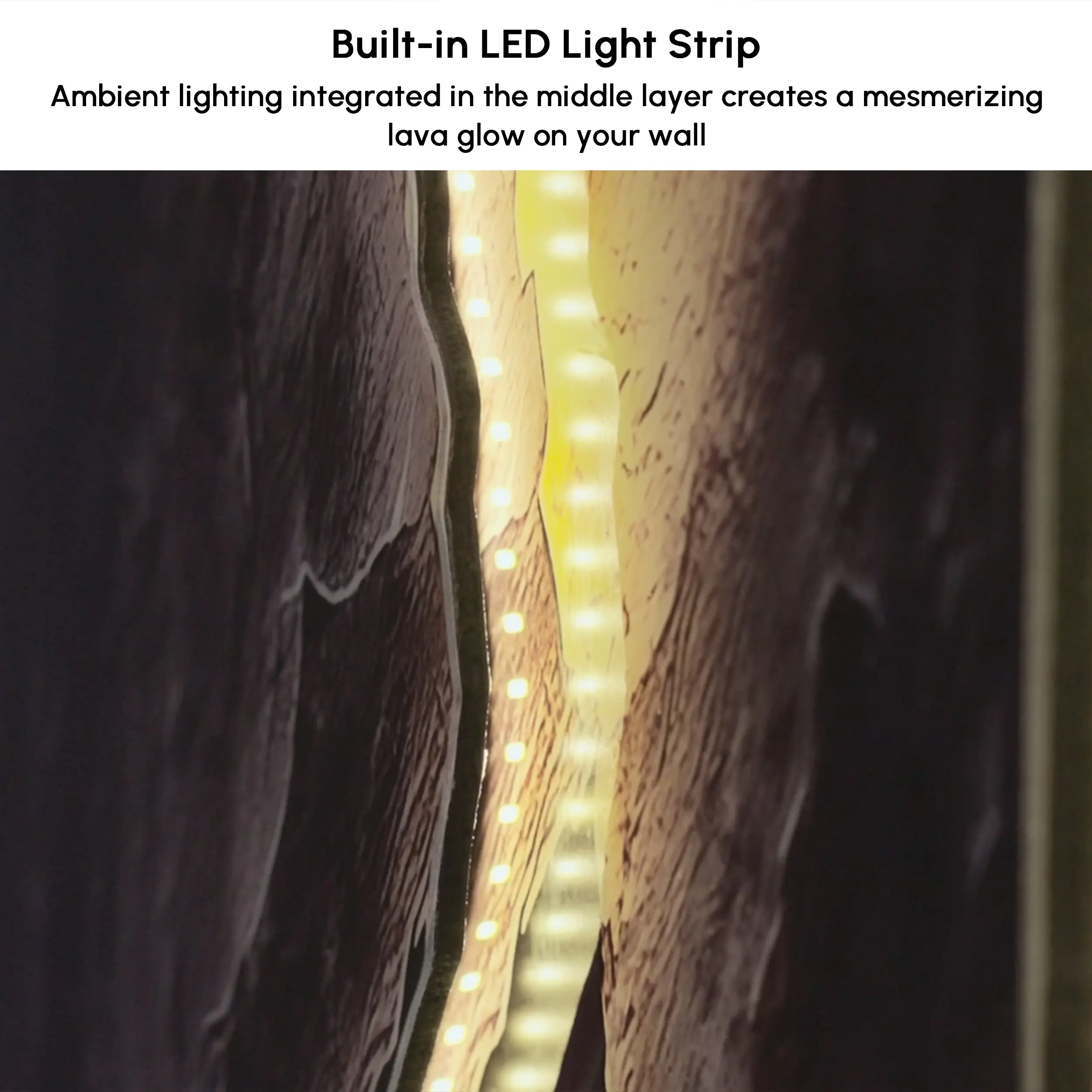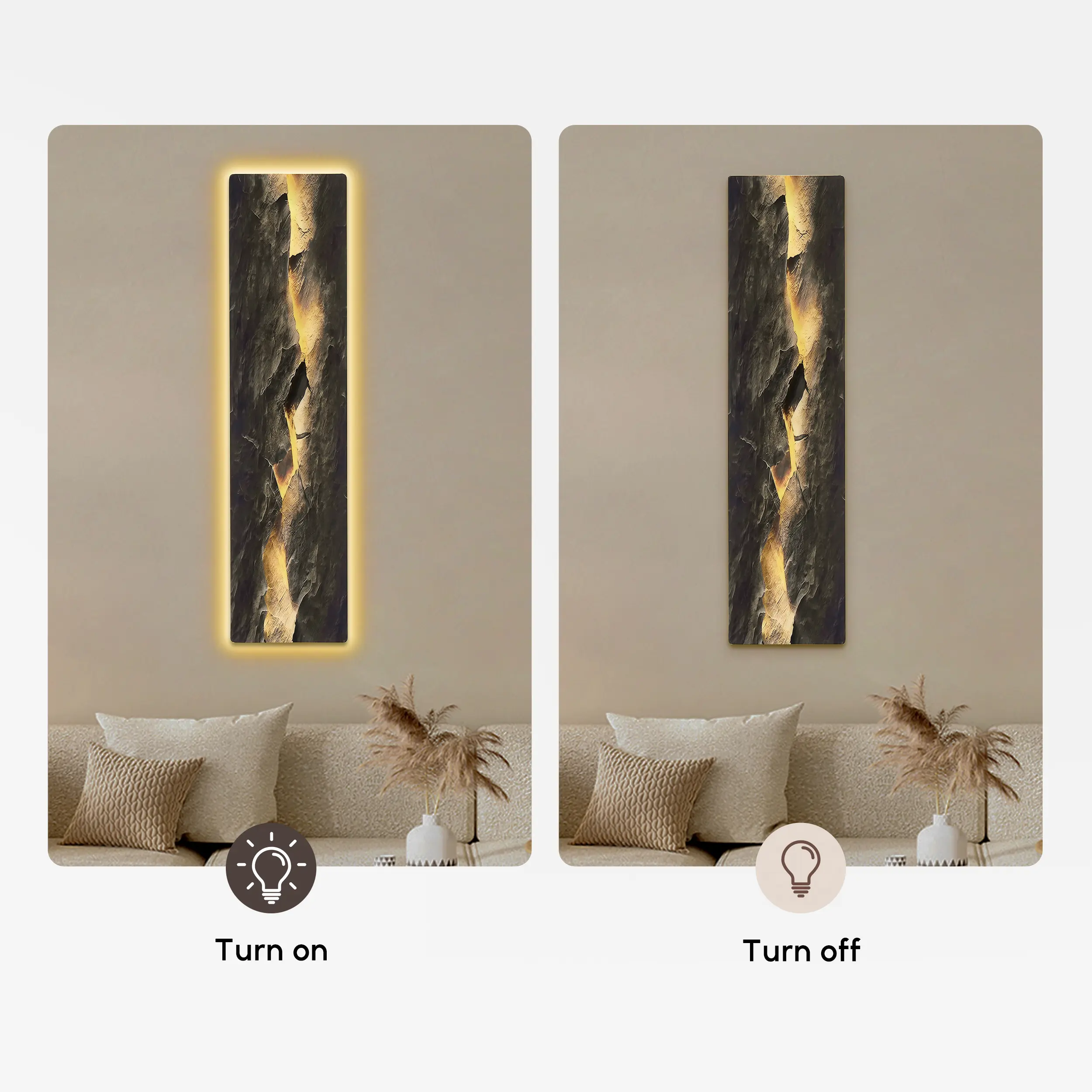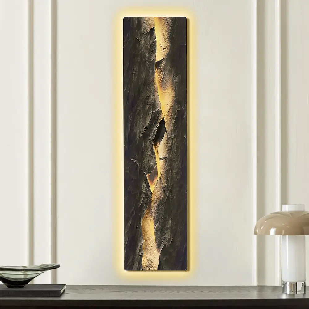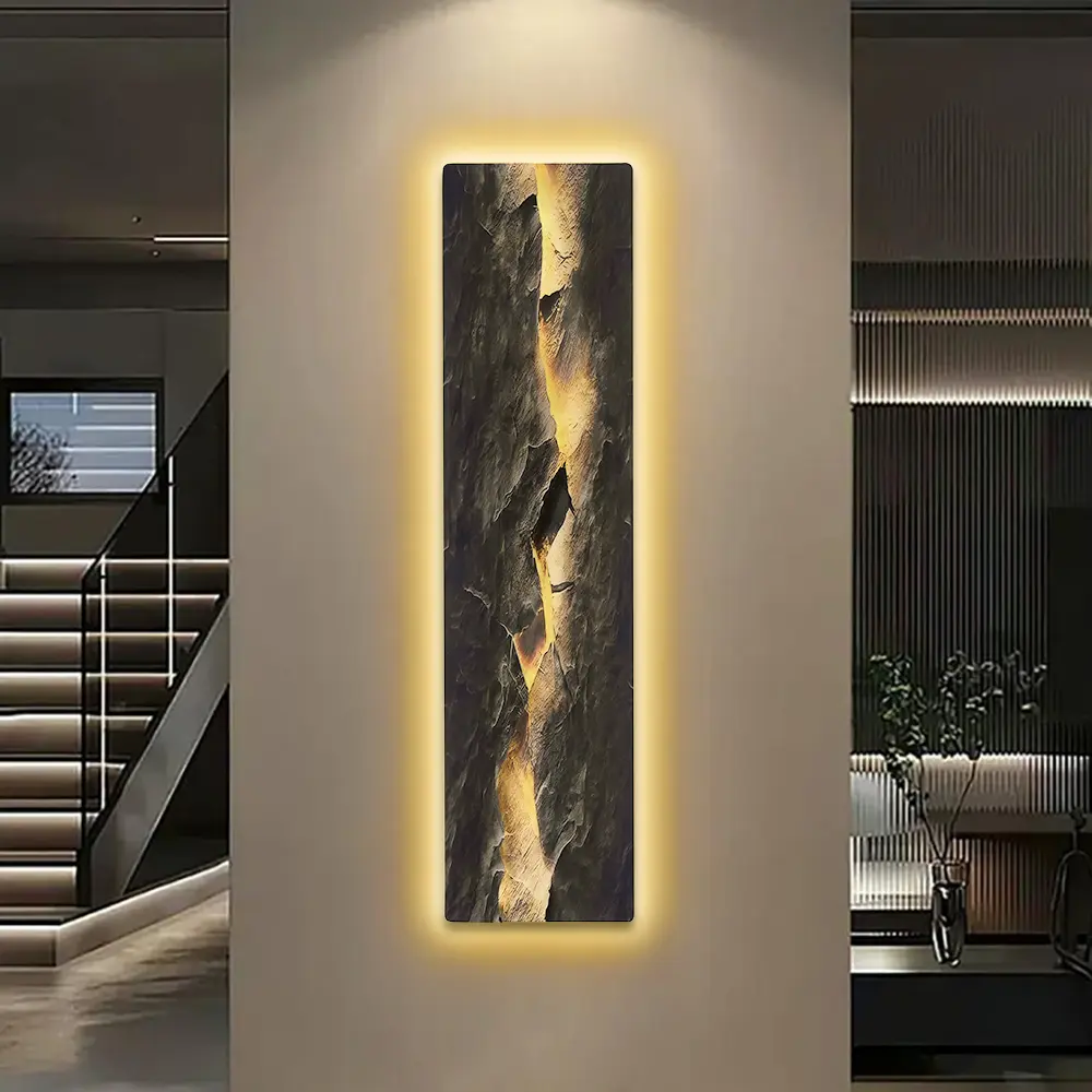 Transform your living space with this striking LED wall art combining modern design and ambient lighting. The textured surface, resembling cracked stone, is beautifully illuminated by built-in LED lights, creating a warm, inviting glow. Perfect for adding a touch of sophistication to any room, this wall art piece is a visual focal point and a source of soft lighting.