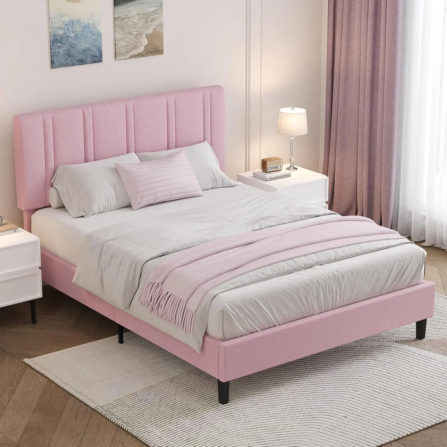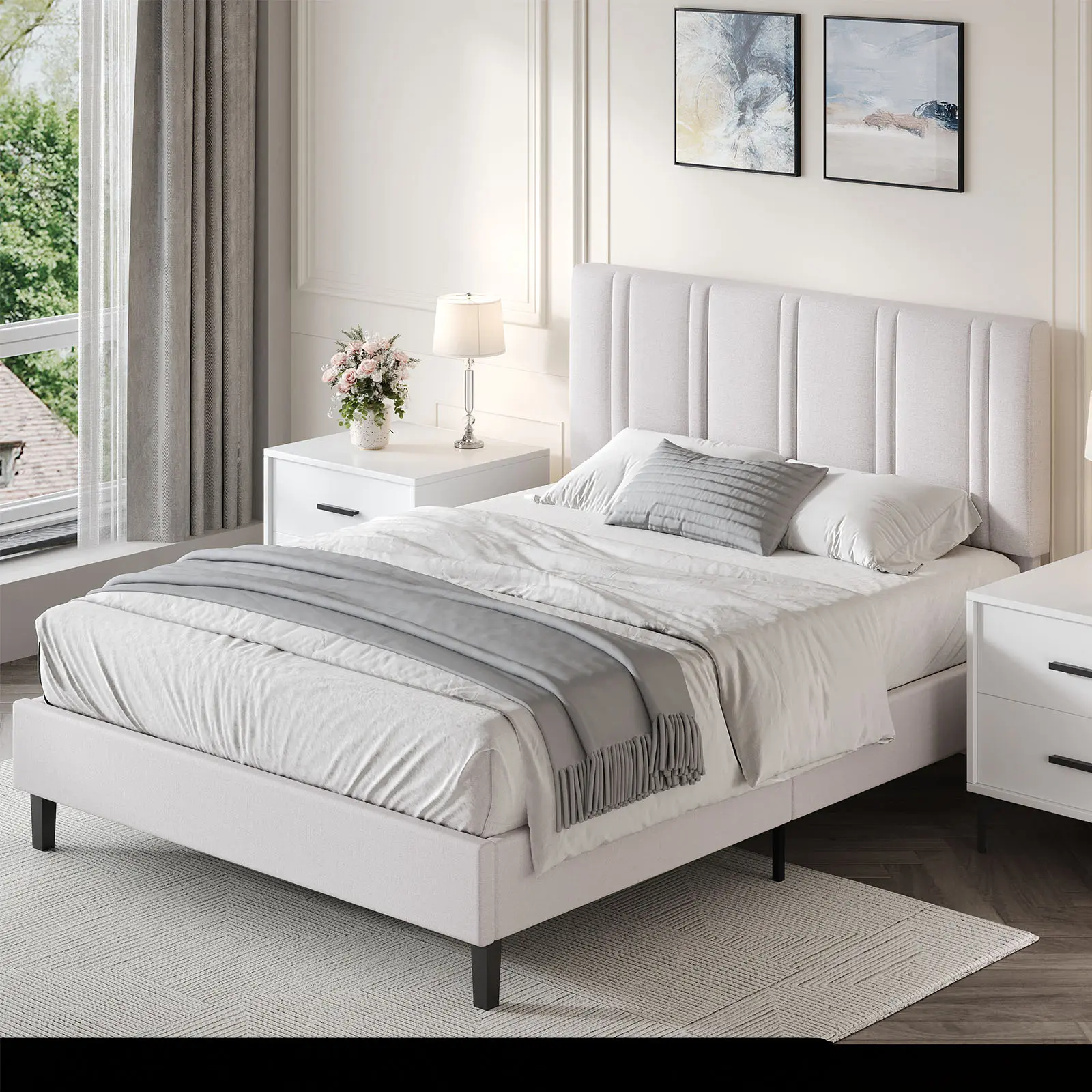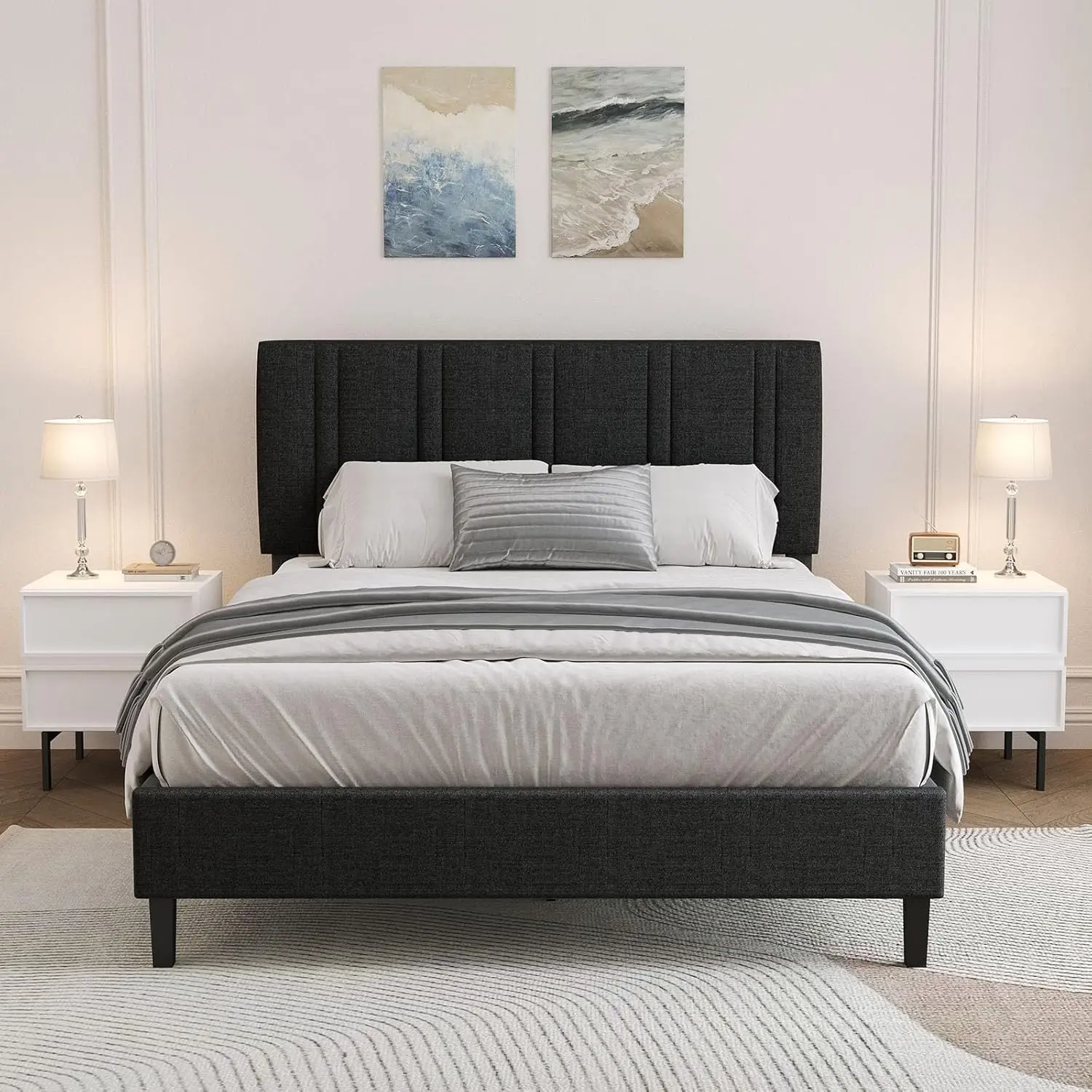 ·Elegant Upholstered Design: Upholstered platform bed Enhances your bedroom or guest room with a classic, cozy look. Bed frame soft, padded headboard invites relaxation, helping you unwind after a busy day