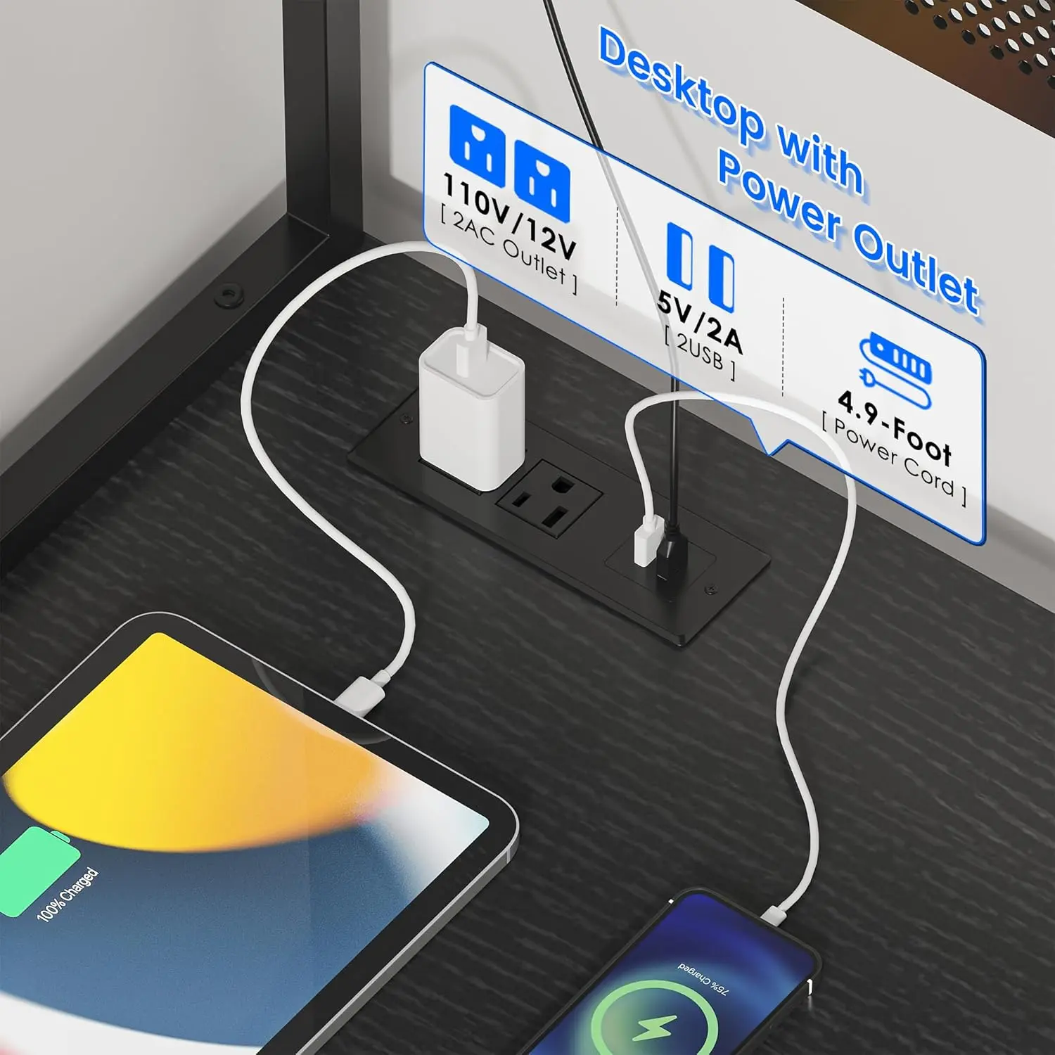 ·【Built-in Desktop Power Outlet】The desktop comes with a built-in power outlet (5V/2A, 2AC Outlet), eliminating the need for extra extension cords. Conveniently charge your laptop, phone, tablet, or gaming accessories directly from your desk—no more struggling with insufficient sockets, making your daily use smoother and hassle-free