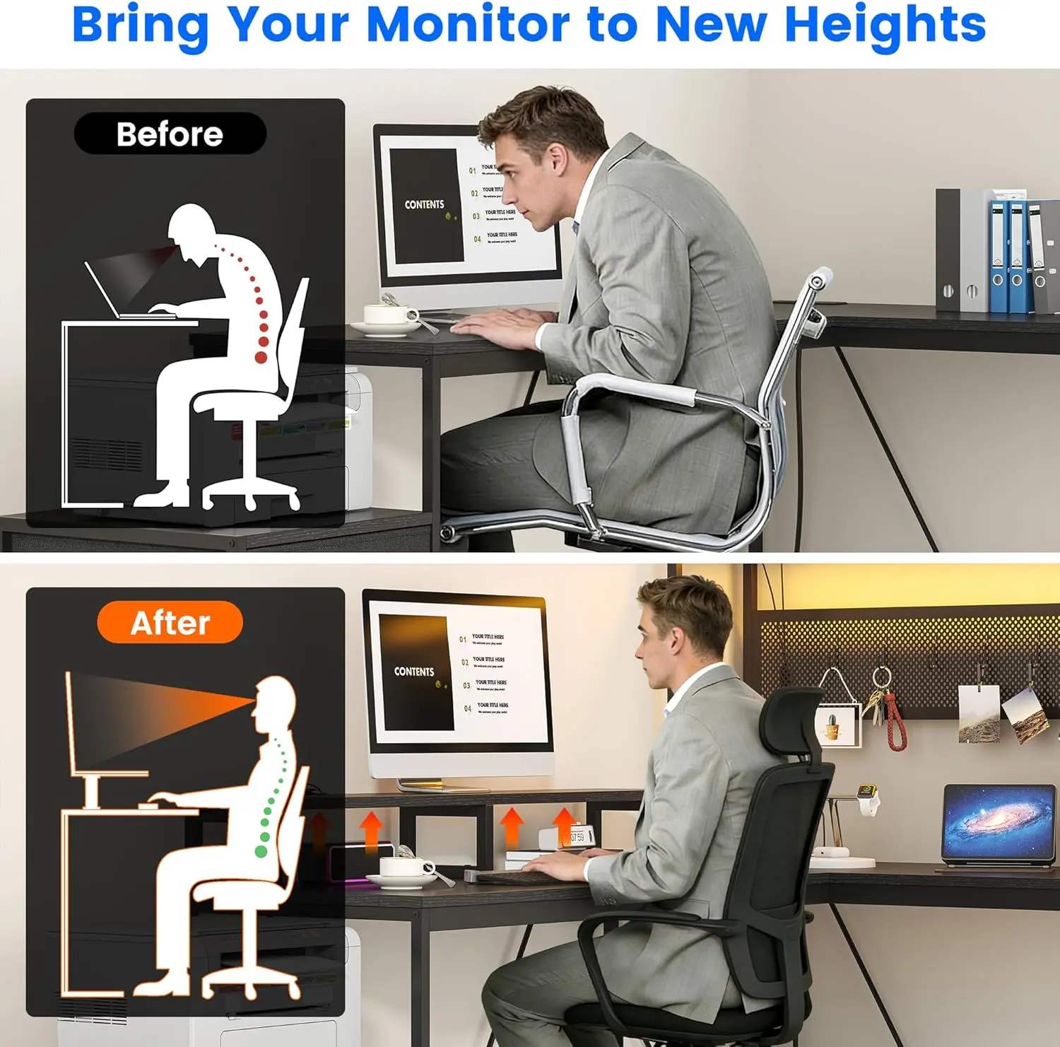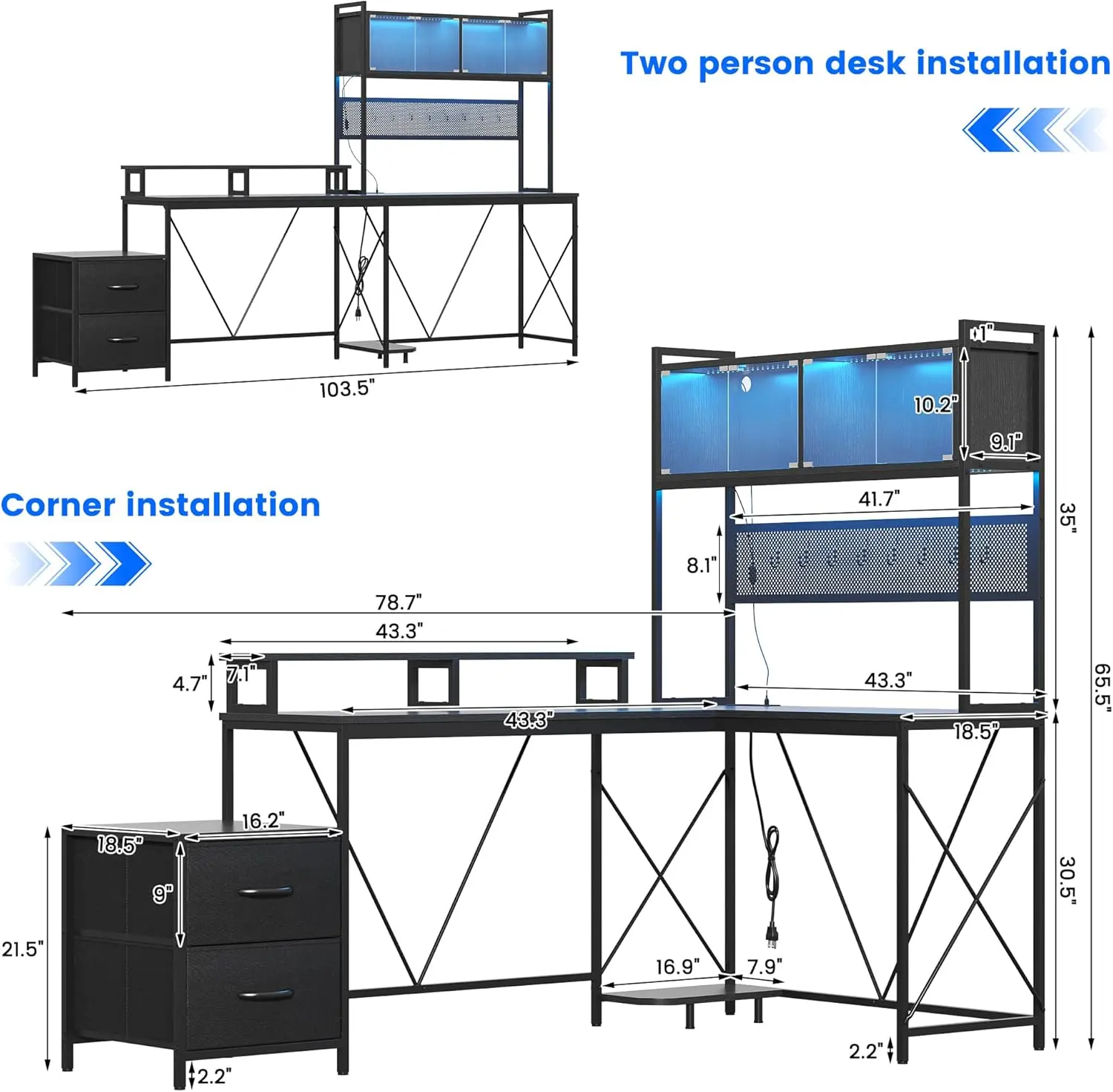 ·【Large L-Shaped Desktop & Monitor Stand】With dimensions of 103.5''L x 17''W x 65.5''H, the extra-large L-shaped desktop offers abundant space for all your gear. The built-in monitor stand elevates your screen to eye level, reducing neck strain—perfect for long workdays, gaming marathons, or study sessions, letting you stay comfortable and focused