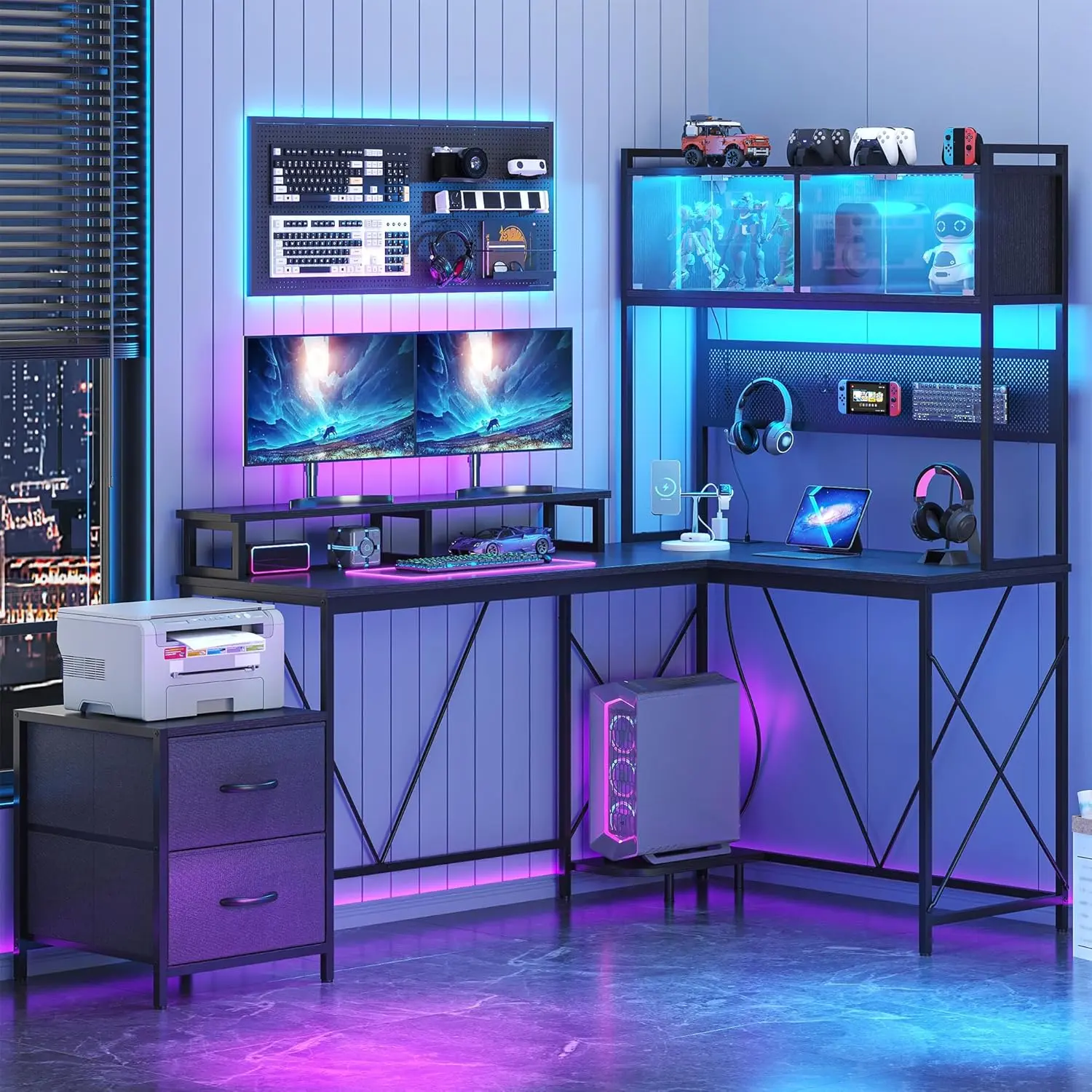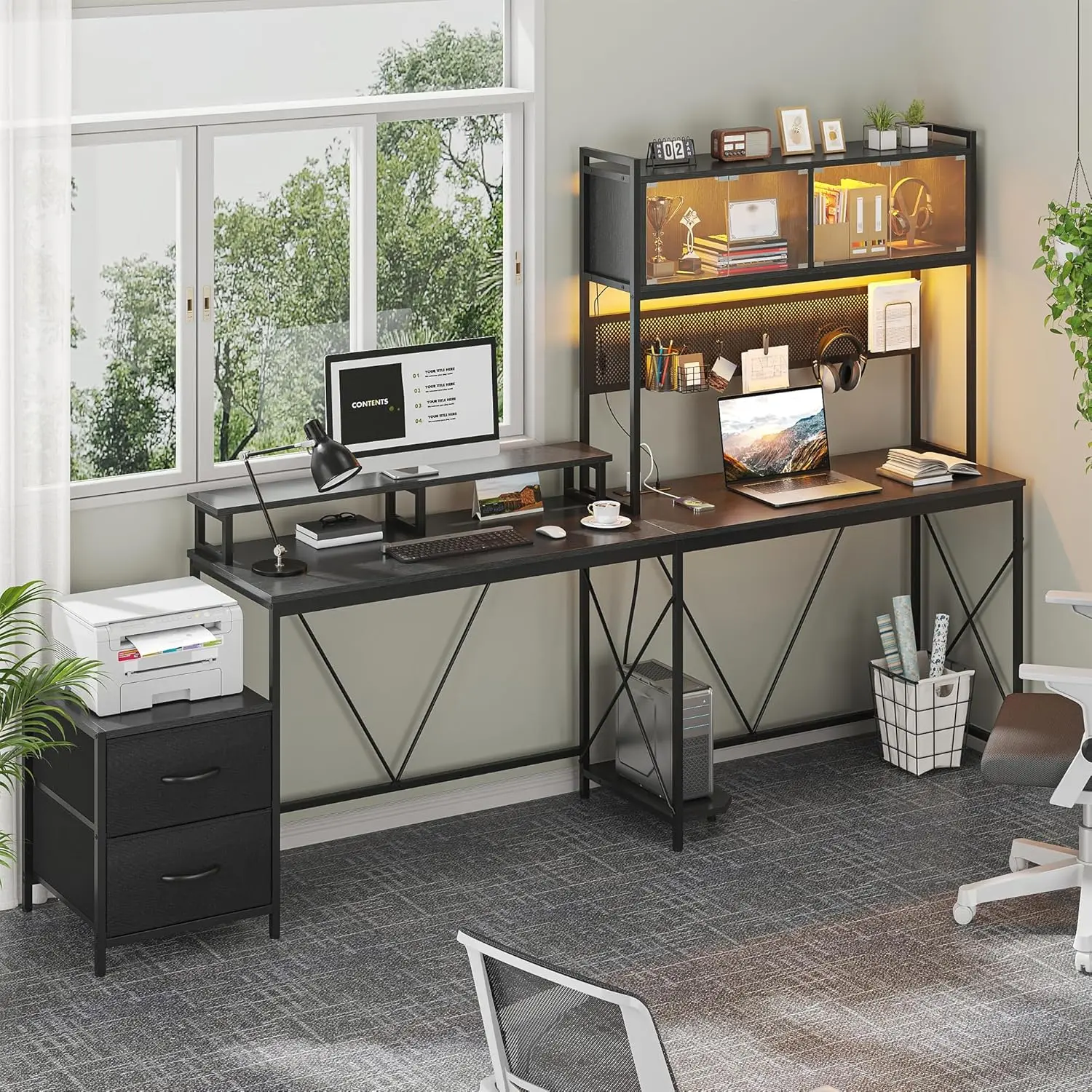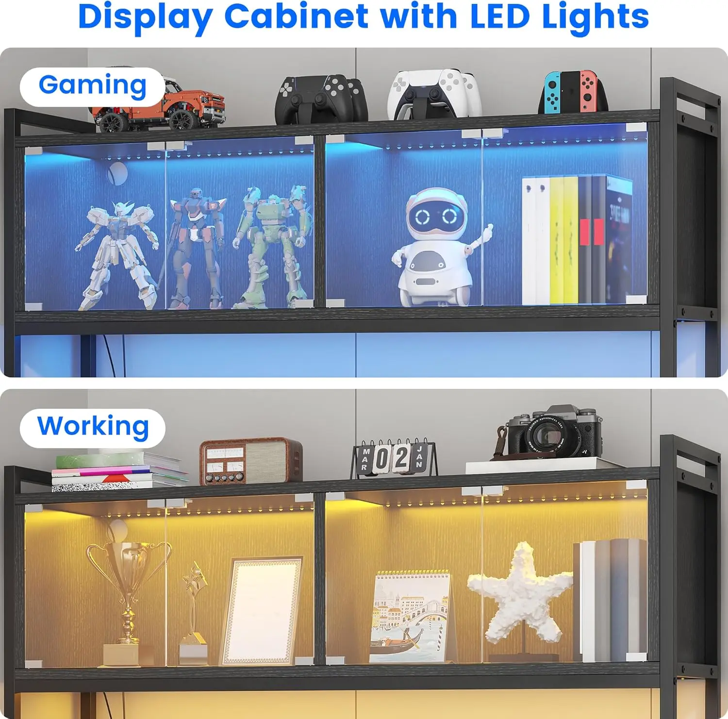 ·【Ample Storage】Featuring 2 LED-lit display cabinets, 2 storage drawers, and 3 open shelves, this desk delivers massive storage capacity. The LED display cabinets beautifully showcase your game figures, photo albums, or decorations while keeping them dust-free; the drawers tuck away small items neatly, and the 3-tier open shelves hold books, files, or a printer—keeping your workspace tidy and organized