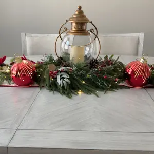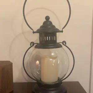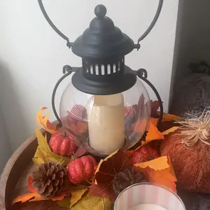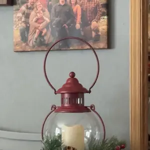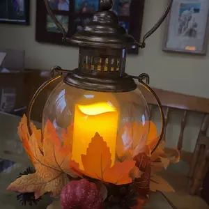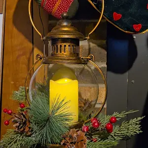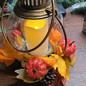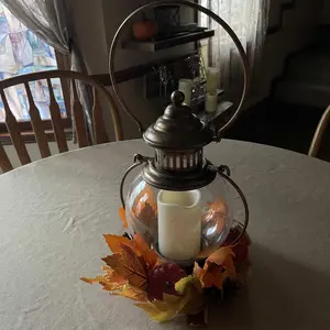 Beautiful large lantern with remote and greenery for both fall and Christmas.