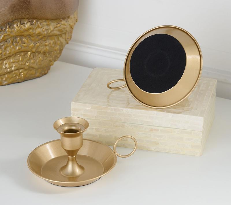 These Home Reflections Set of 2 Metal Vintage Taper Holders are the perfect addition to your home. Measure approx.: 7"L x 5-1/2"W x 3-1/3"H Care: Clean with soft cloth. For indoor use only. Made of metal. Choice of color: Black or Gold. Imported.