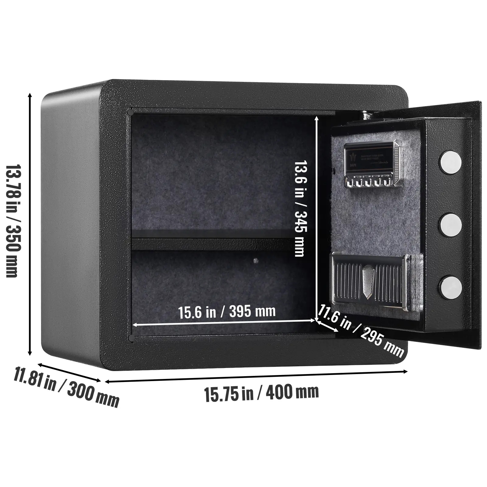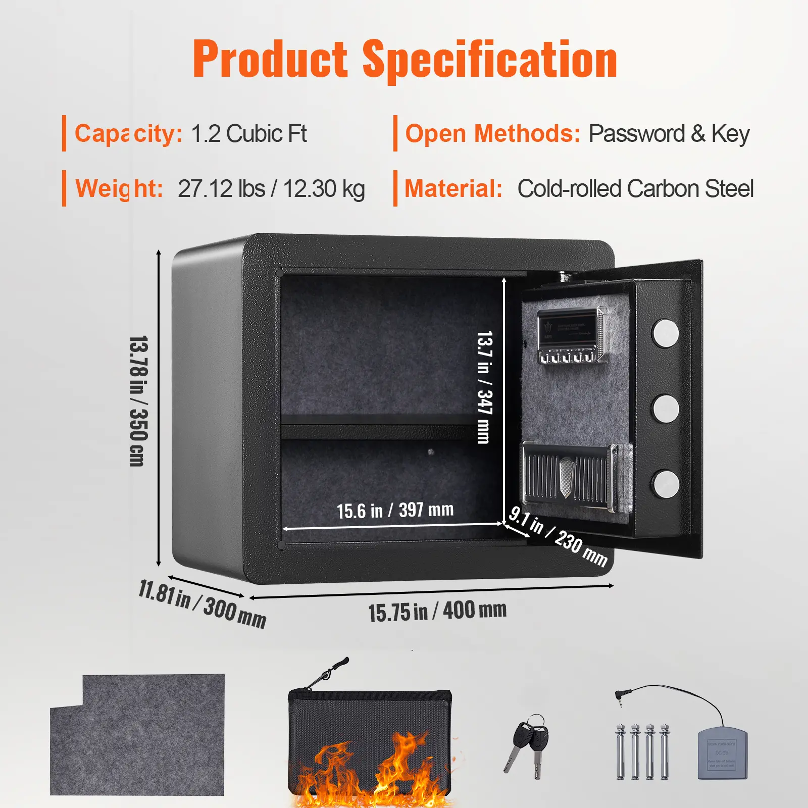 • Spacious 1.2C Capacity: Our small safe has a 1.2 cubic feet capacity, making it ideal for organizing valuable items such as cash, passports, jewelry, gold, watches, and documents. Its external size is 15.75x11.81x13.78 in, while the internal size is 15.63x9.06x13.66 in, allowing it to fit discreetly in drawers, cabinets, and wardrobes at home, office, or hotel.