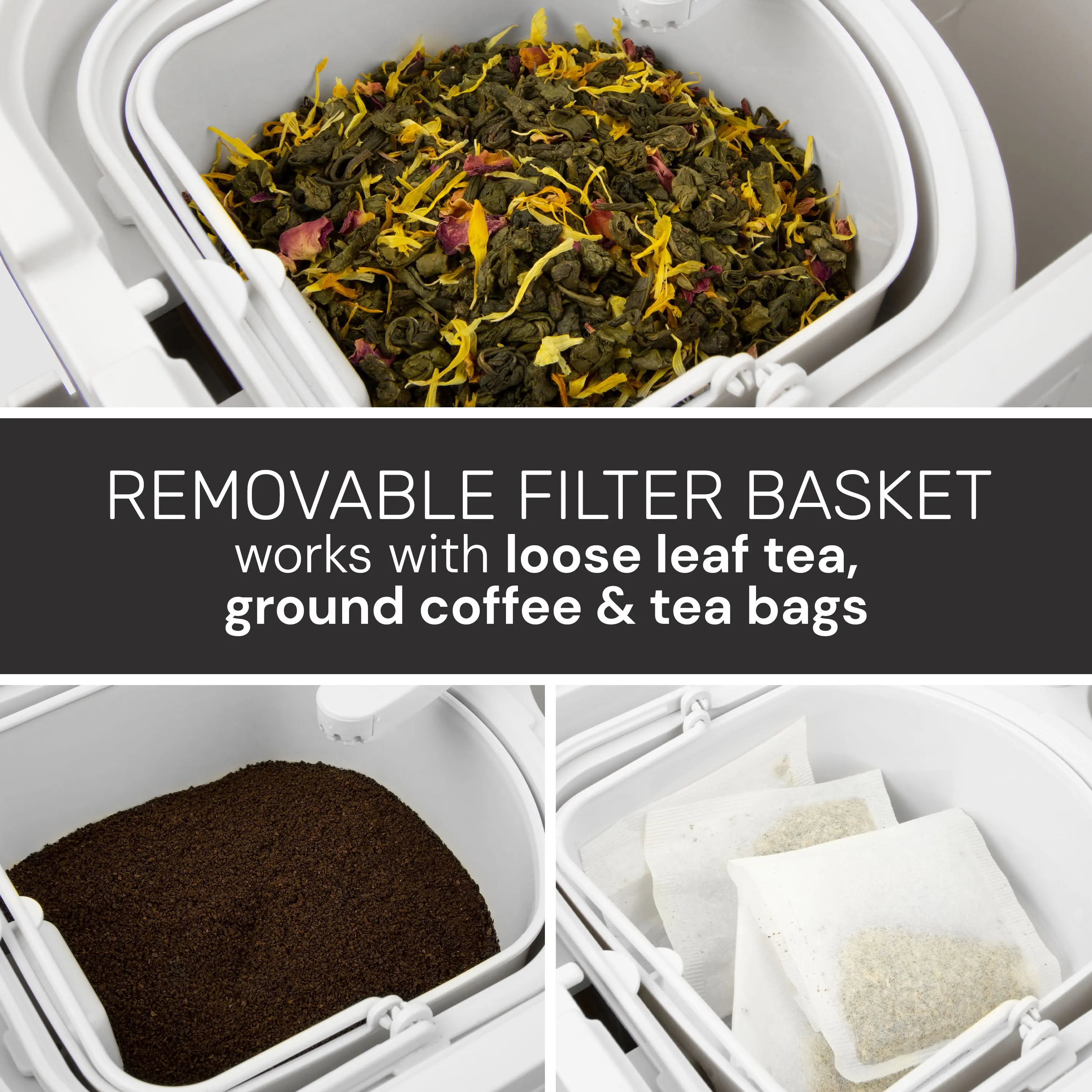 The black stainless steel design gives it an elegant look, making it a good fit for any kitchen! The filter basket works with fresh ground coffee, tea bags, and loose leaf teas. The shower head ensures complete saturation and optimal flavor extraction.