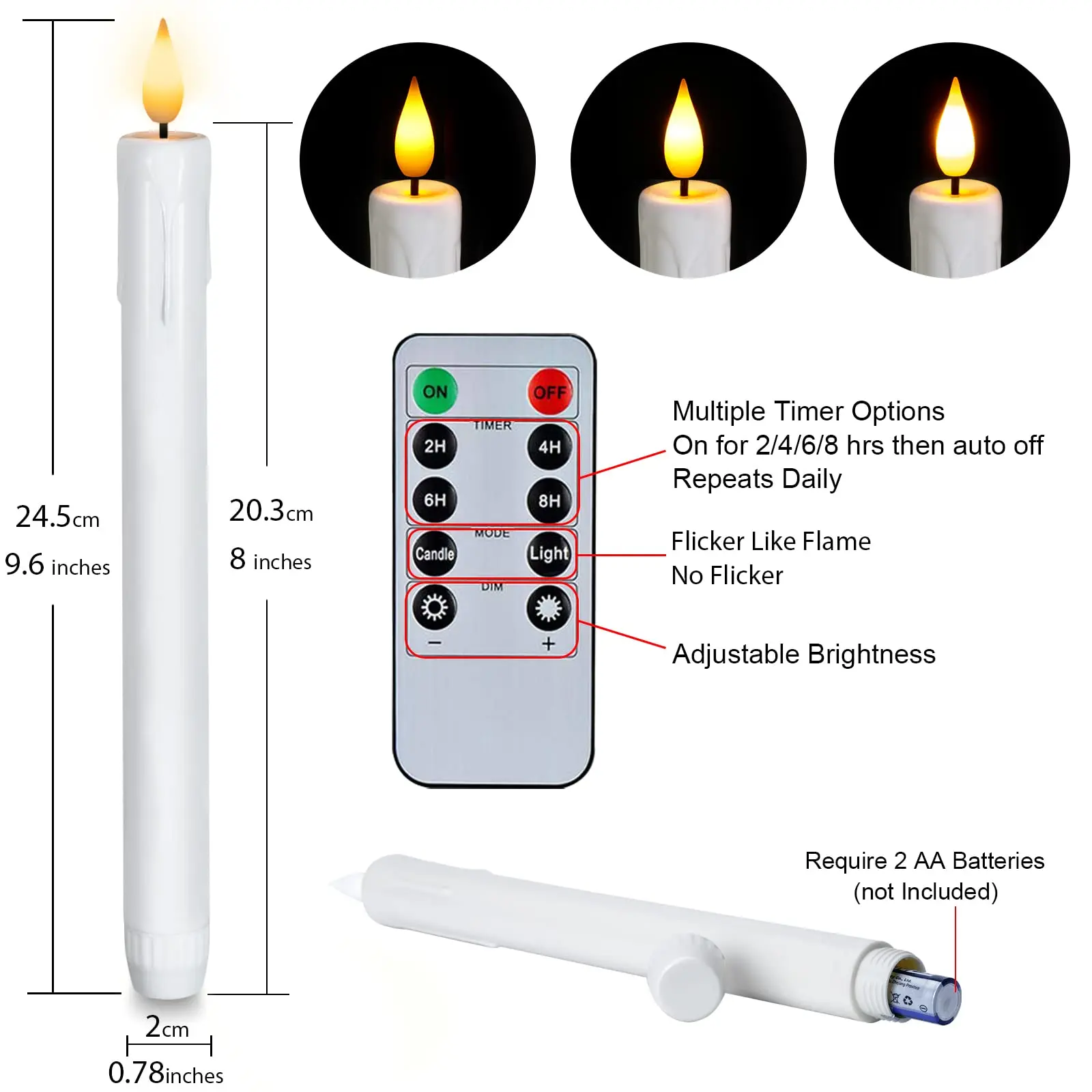 ·Extra Long Life: Instead of using small batteries, each of our LED taper candles requires 2 AA batteries (not included), which could provide 20+ days of working time. Saving your time in replacing the batteries and money spent on the candles. And the plastic has no hazard of cracking and breaking.
