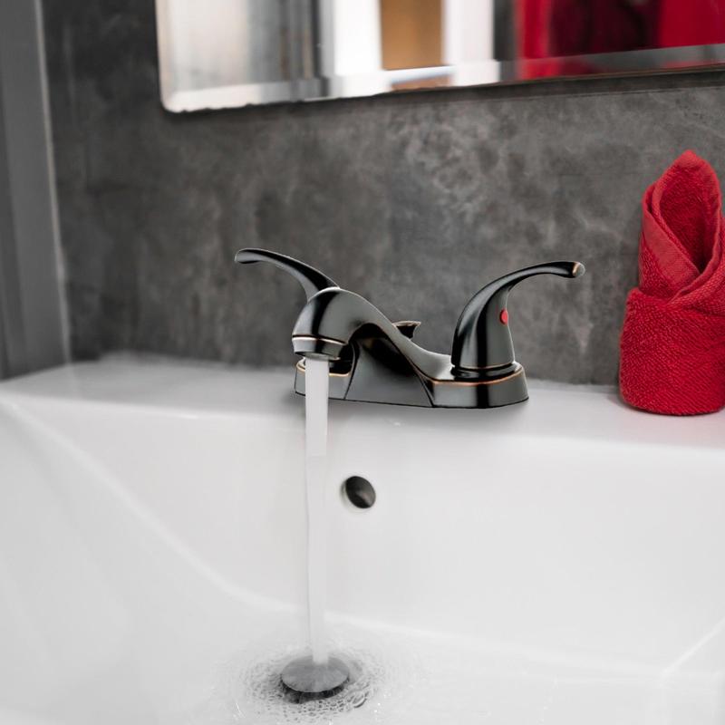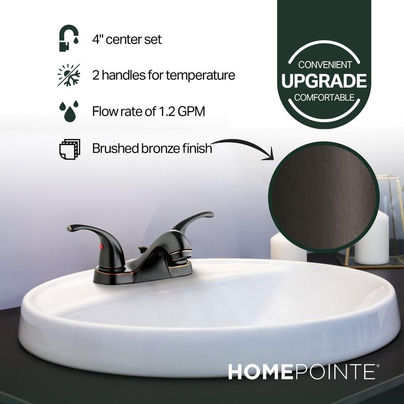 Clean your hands and brush your teeth in style with the Center-Set Lavatory Faucet with 2 Zinc Lever Handles from HomePointe.Boasting a stunning brushed bronze finish, this faucet is a visual delight to your kitchen or bathroom and is designed to withstand the test of time. Featuring 2 zinc lever handles, this bathroom faucet provides you with effortless control over the water temperature, ensuring a customized and comfortable experience every time you use it. This sink essential not only enhances its aesthetic appeal but also ensures convenient and comfortable cleaning and rinsing, making daily tasks a breeze.With a flow rate of 1.2 gallons per minute (GPM), this kitchen faucet balances water conservation with optimal performance. The 4-inch center-set configuration adds versatility, allowing easy installation on most standard sink setups. This thoughtful design ensures compatibility with your existing bathroom layout while providing a stylish and functional upgrade. As a comprehensive solution, this lavatory faucet comes complete with a pop-up, streamlining the installation process and offering added convenience.Upgrade your lavatory with the HomePointe Center-Set Lavatory Faucet, an ideal blend of modern design, durable construction, and user-friendly features that will enhance the aesthetic appeal and functionality of your bathroom space.