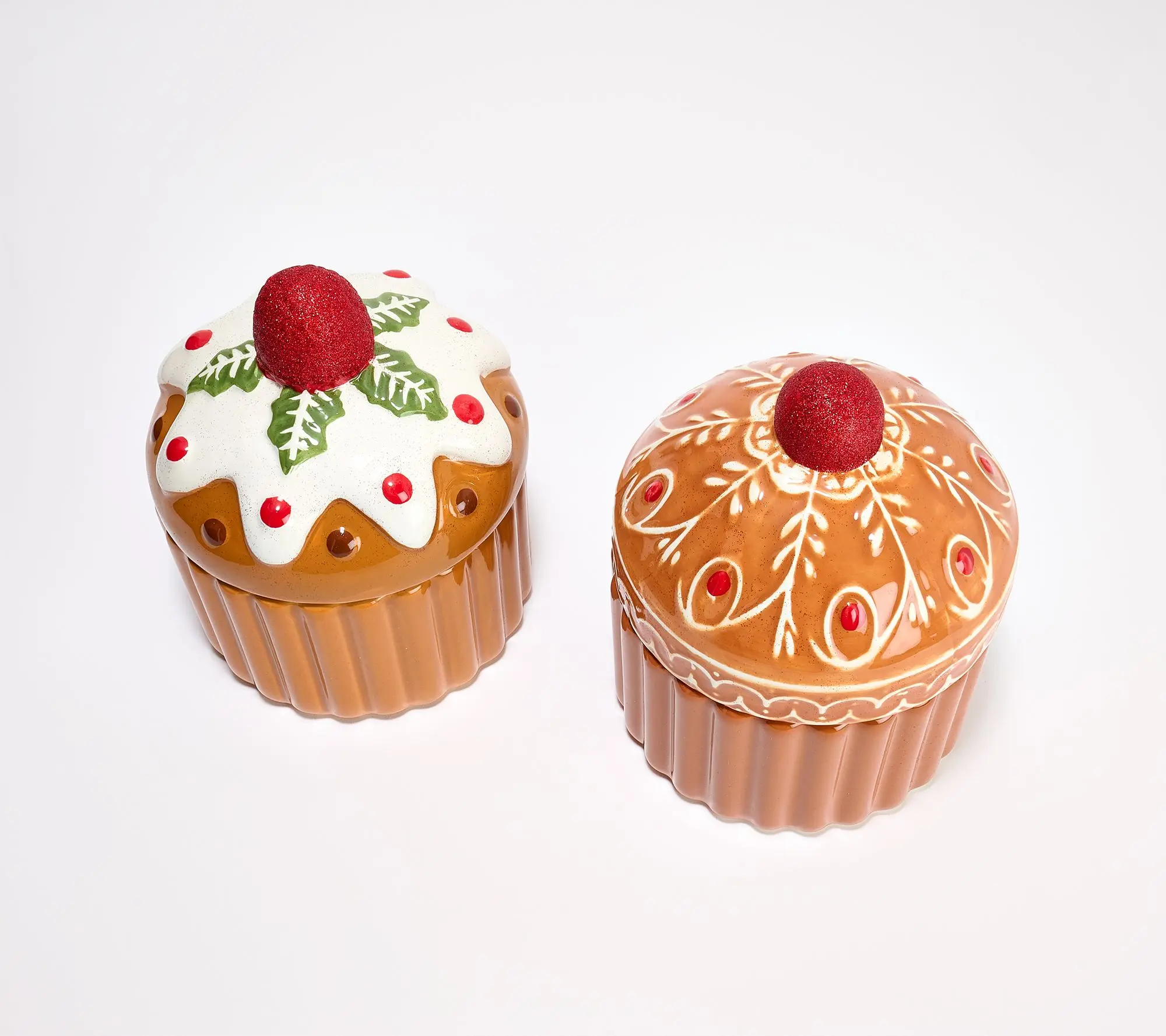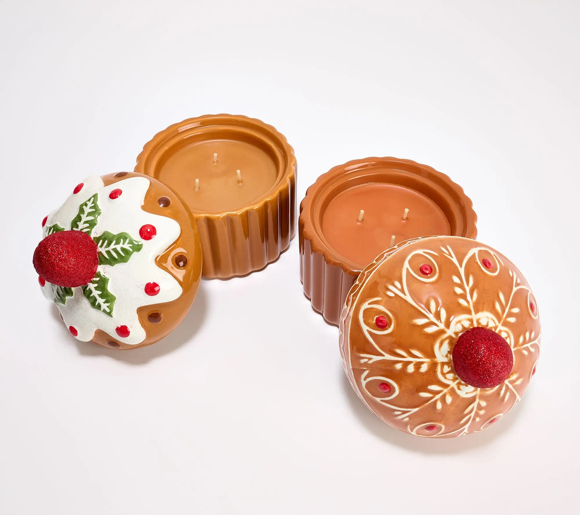 S/2 Ceramic Holiday Cookie Candles, 2 lid designs, 2 scents included Brown scalloped base is same on both, Gingerbread style lid filled w- Grandma's Gingerbread (Warm Gingerbread, Ground Cinnamon, Crushed Nutmeg, Brown Sugar Icing); White Icing lid filled w- Chocolate Chip Cookies (Fresh Baked Cookie, Dark Chocolate Chips, Vanilla Bean, Brown Sugar). Black pad on base to help protect surfaces. Each 4.5" D x 5.8" H, 3 wicks, 6 oz / 170 g fill Resuse ceramic for d cor after done burning.