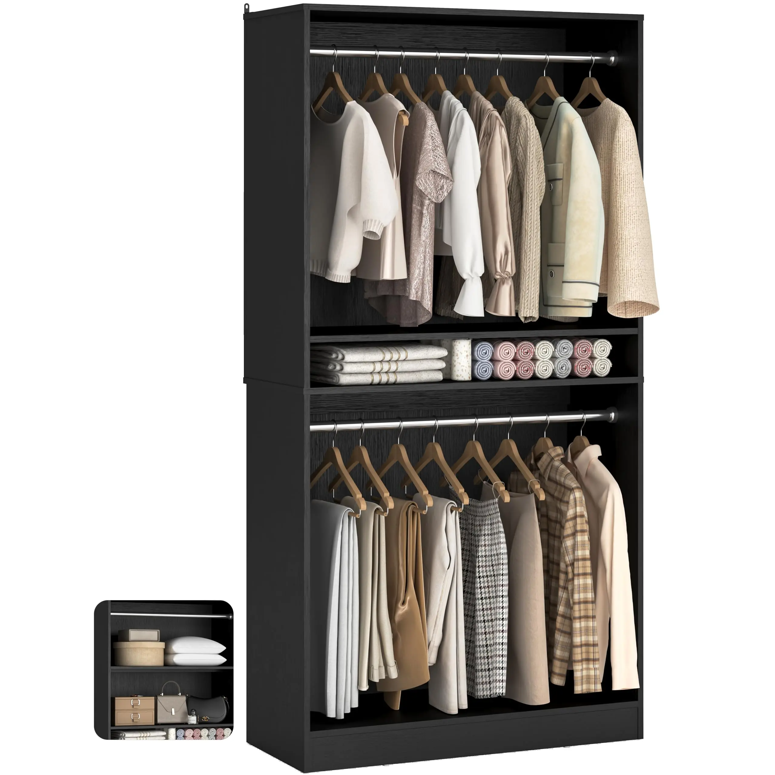 ·Configurable: 2 hanging rods and 3 adjustable shelves. Flexibility for short/long garments, folded clothes, handbags, or seasonal items. 📏