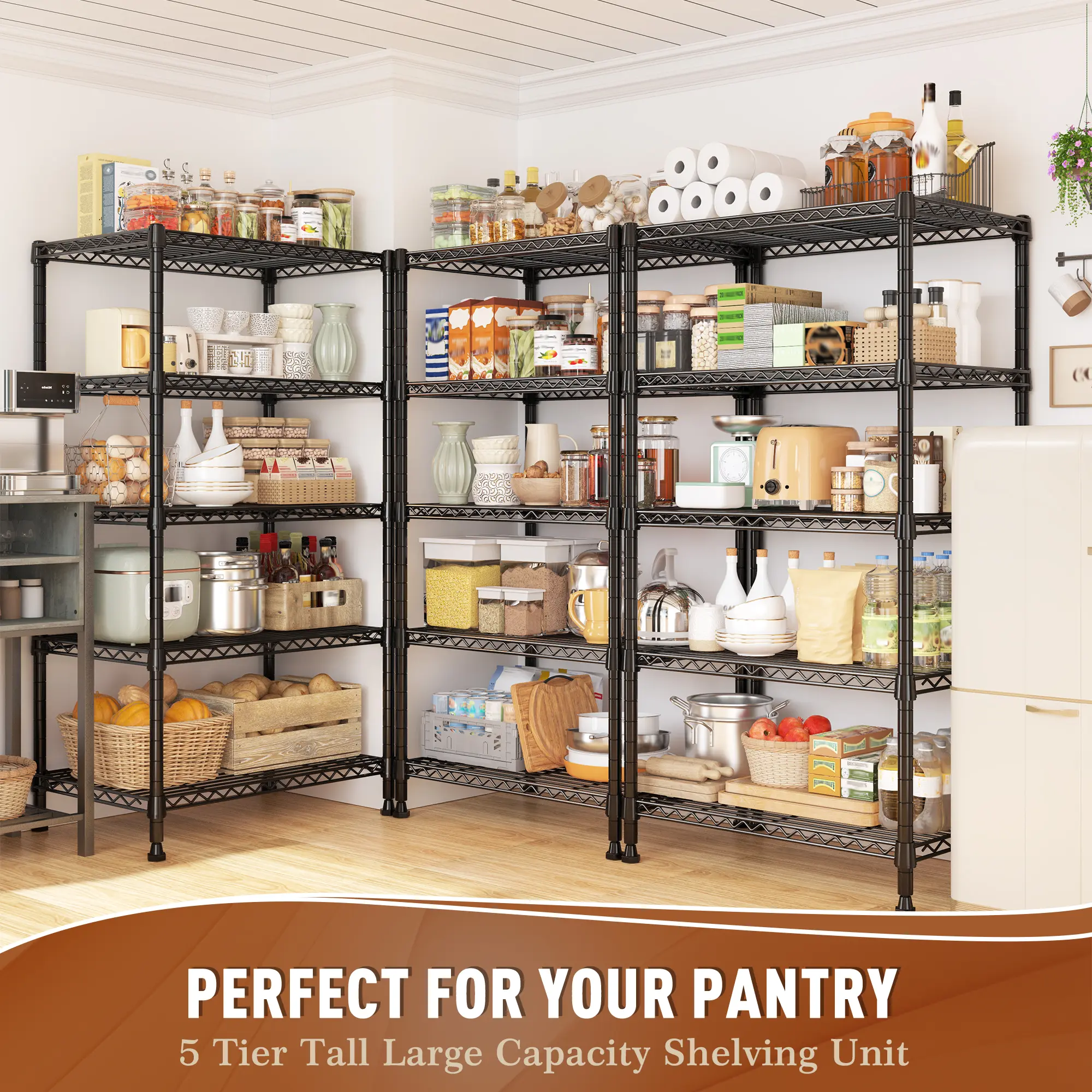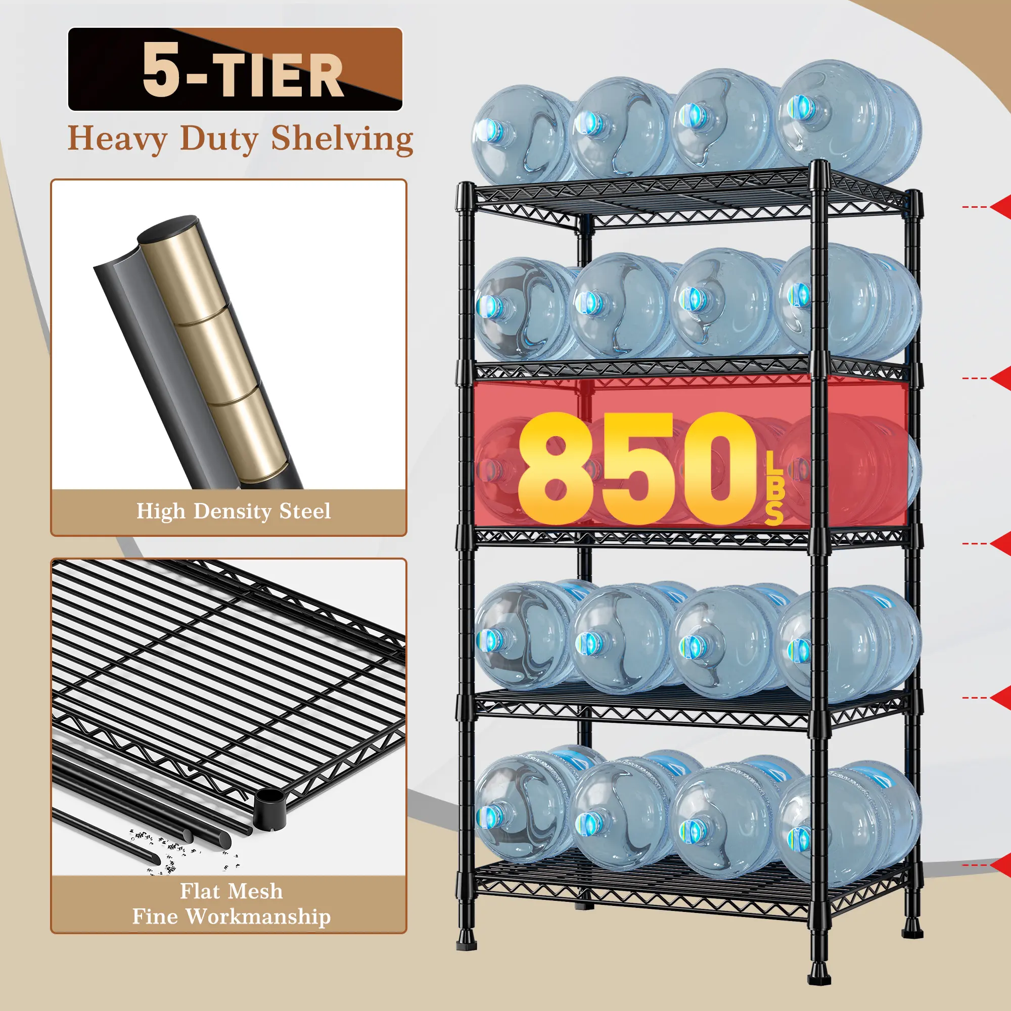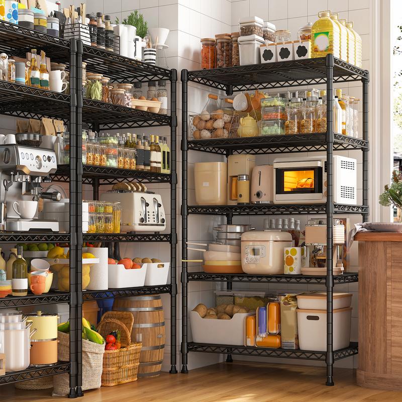 850 LBS Super Sturdy Metal Shelving This metal shelving unit, made of heavy-duty steel wire with special coating, can bear 170 lbs per shelf, totalling 850 lbs. It's your reliable storage partner.