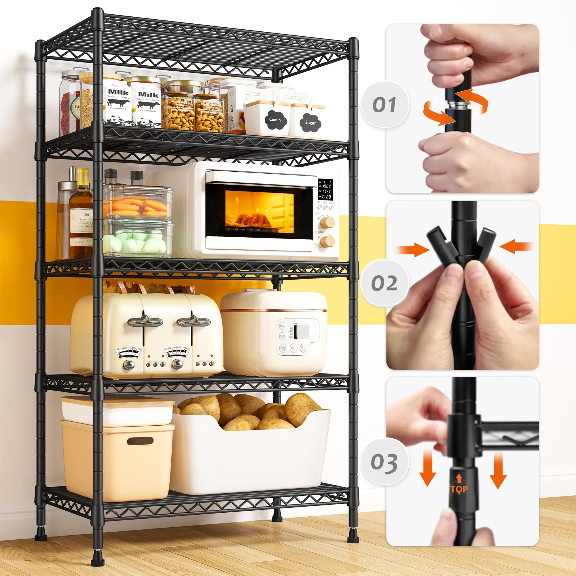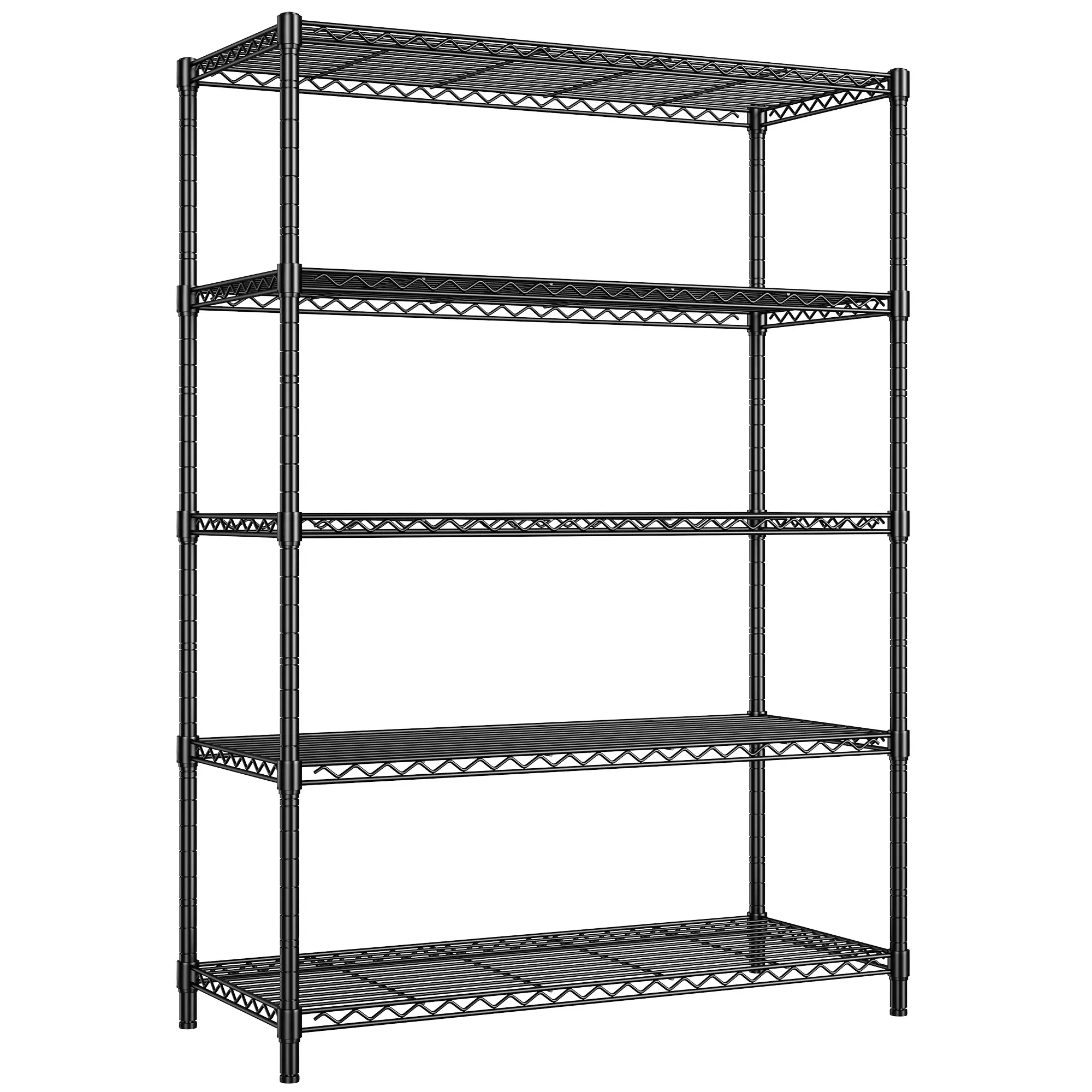 850 LBS Super Sturdy Metal Shelving This metal shelving unit, made of heavy-duty steel wire with special coating, can bear 170 lbs per shelf, totalling 850 lbs. It's your reliable storage partner.